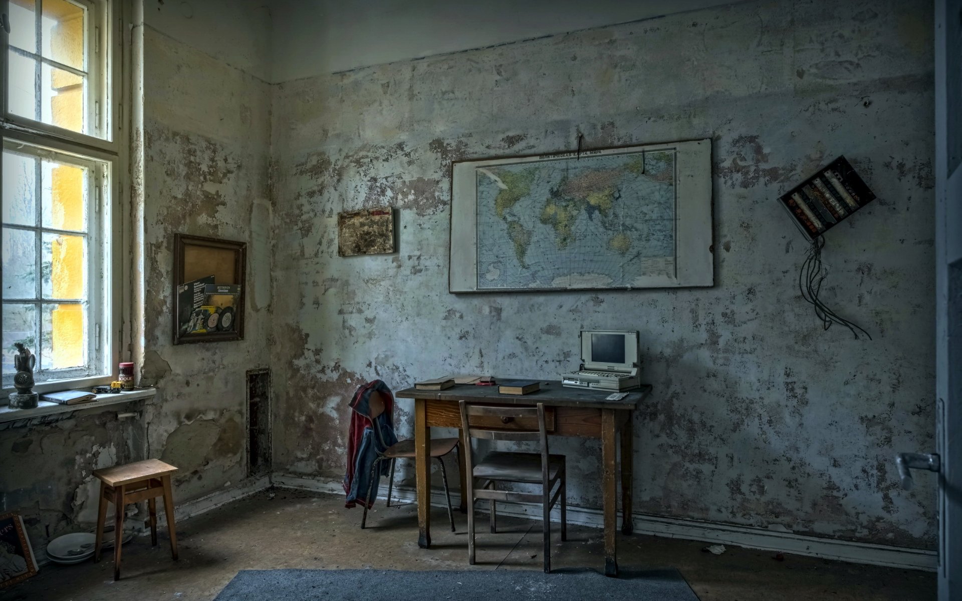Habitación antigua con mesa y sillas cerca del mapa en la paredHabitación antigua con mesa y sillas cerca del mapa en la pared