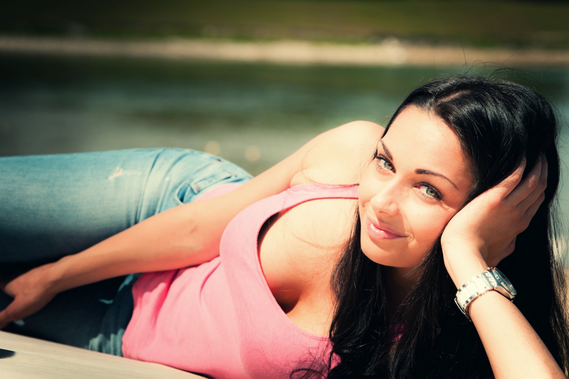 Chica acostada de lado en jeans azules y una camiseta rosaChica acostada de lado en jeans azules y una camiseta rosa