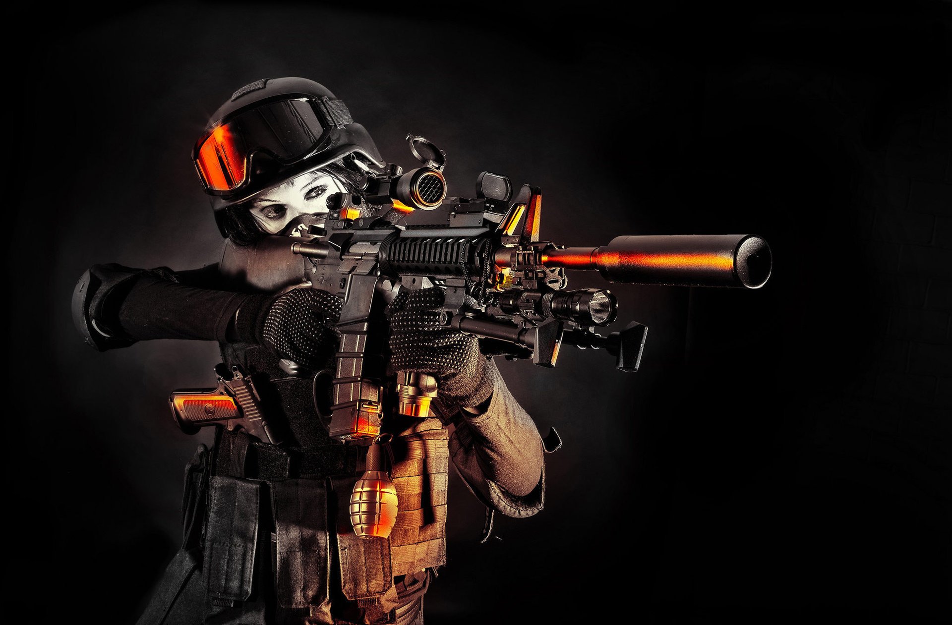 Chica en equipo de combate con armas