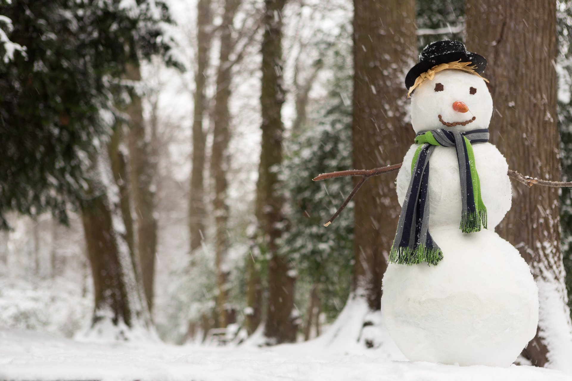Hermoso muñeco de nieve de pie en el bosque junto a un árbolHermoso muñeco de nieve de pie en el bosque junto a un árbol