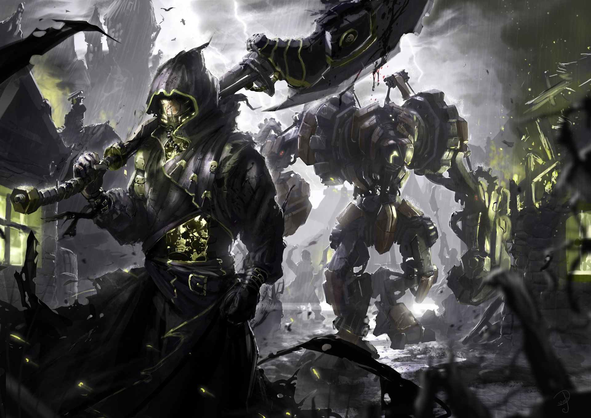 Hay un guerrero en armadura con un arma y detrás de él hay humo negroHay un guerrero en armadura con un arma y detrás de él hay humo negro