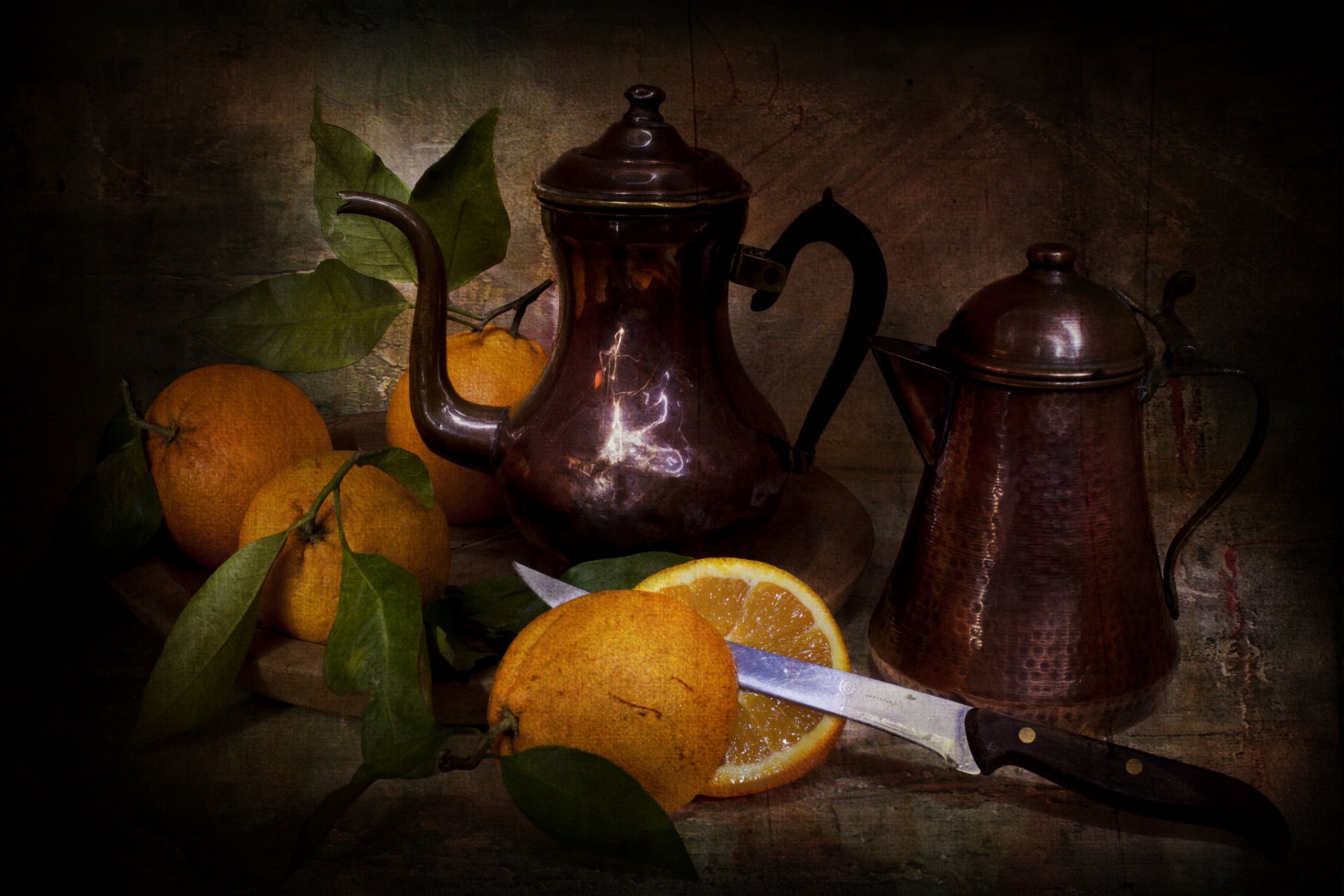 Bodegón Vintage con utensilios de cobre y naranjas