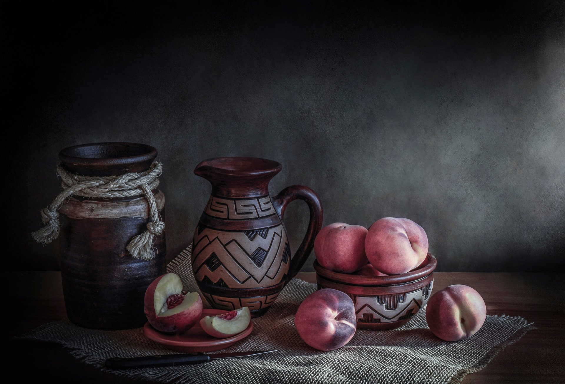 Naturaleza muerta con melocotones, cerezas dulces, un libro y una jarra de líquido rojo