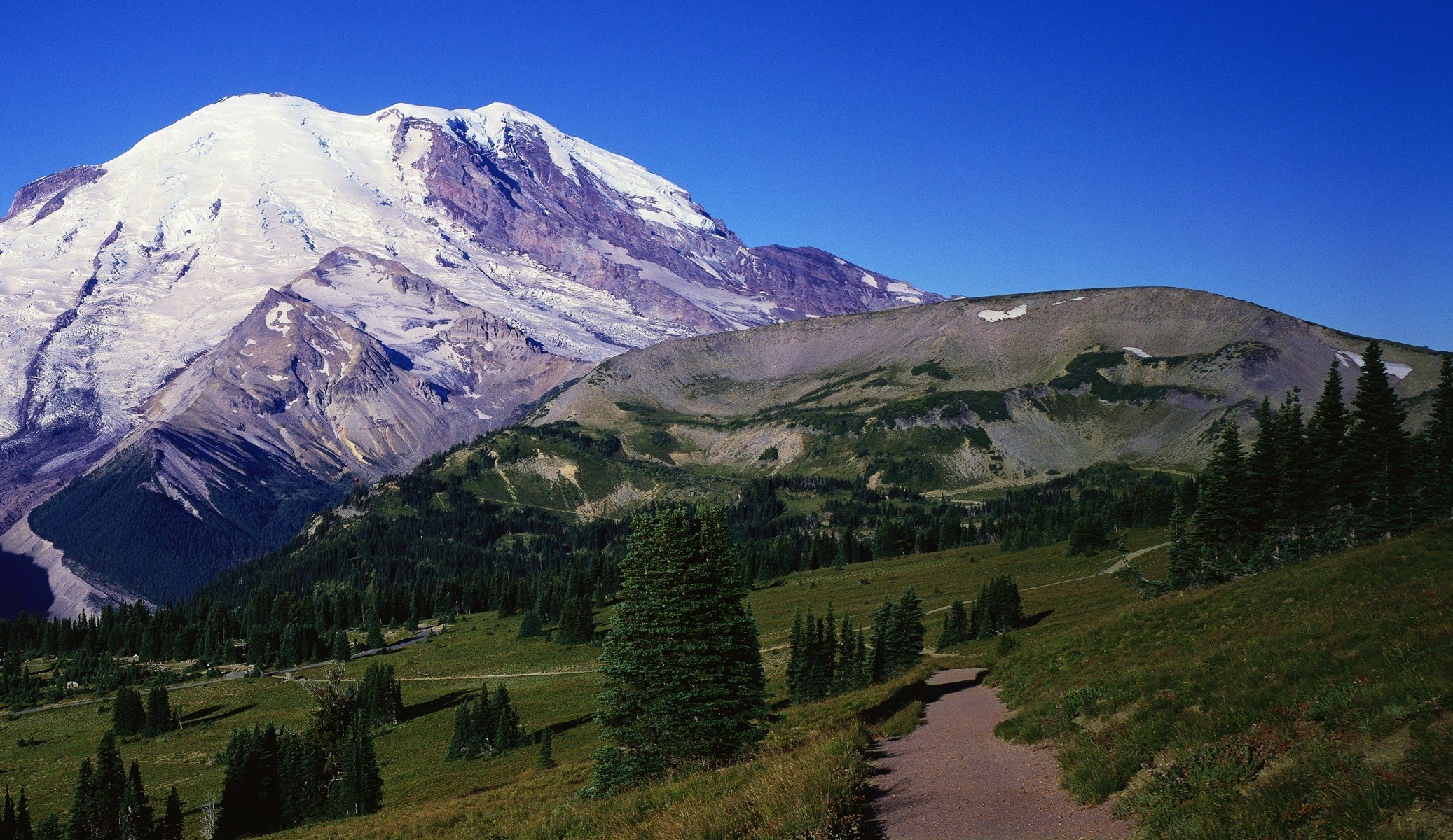 Una montaña nevada y un camino con árboles que conduce a ellaUna montaña Nevada y un camino con árboles que conduce a ella