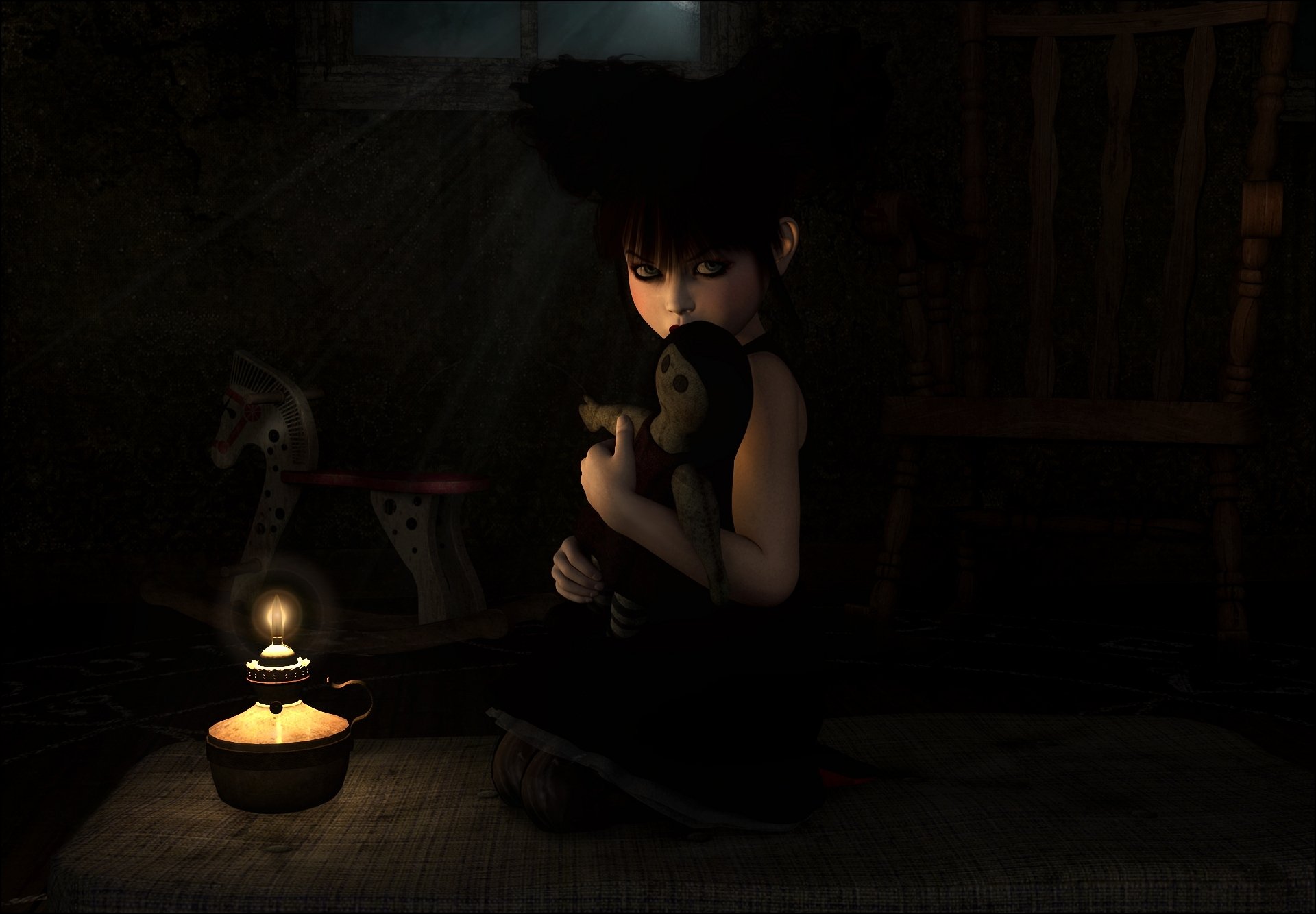 Una niña abraza a una muñeca en la oscuridad junto a una vela