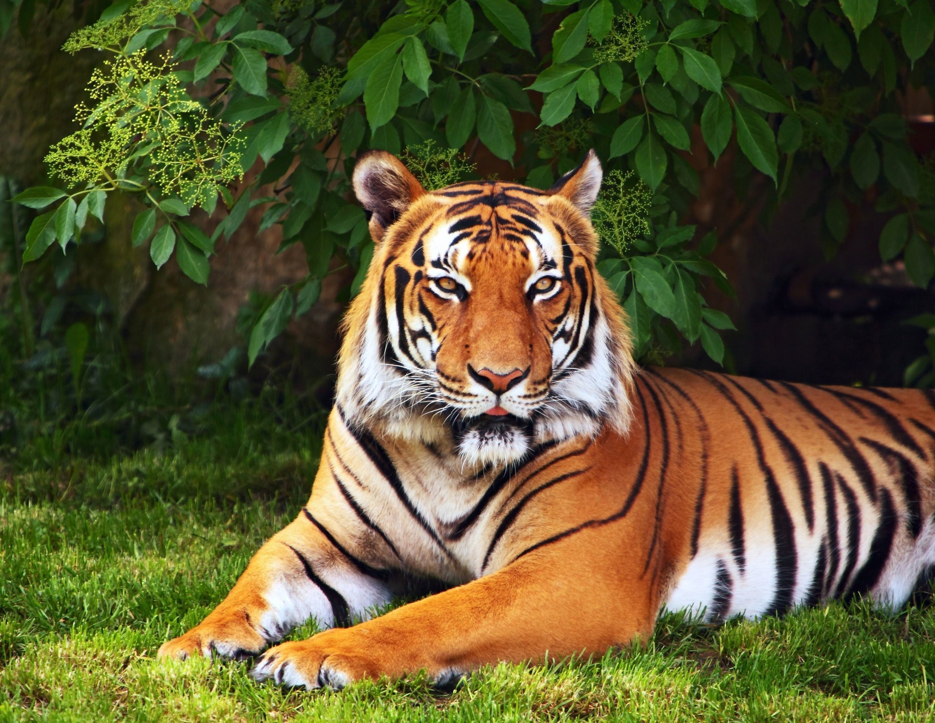 El temible tigre descansa entre la espesa vegetación verde