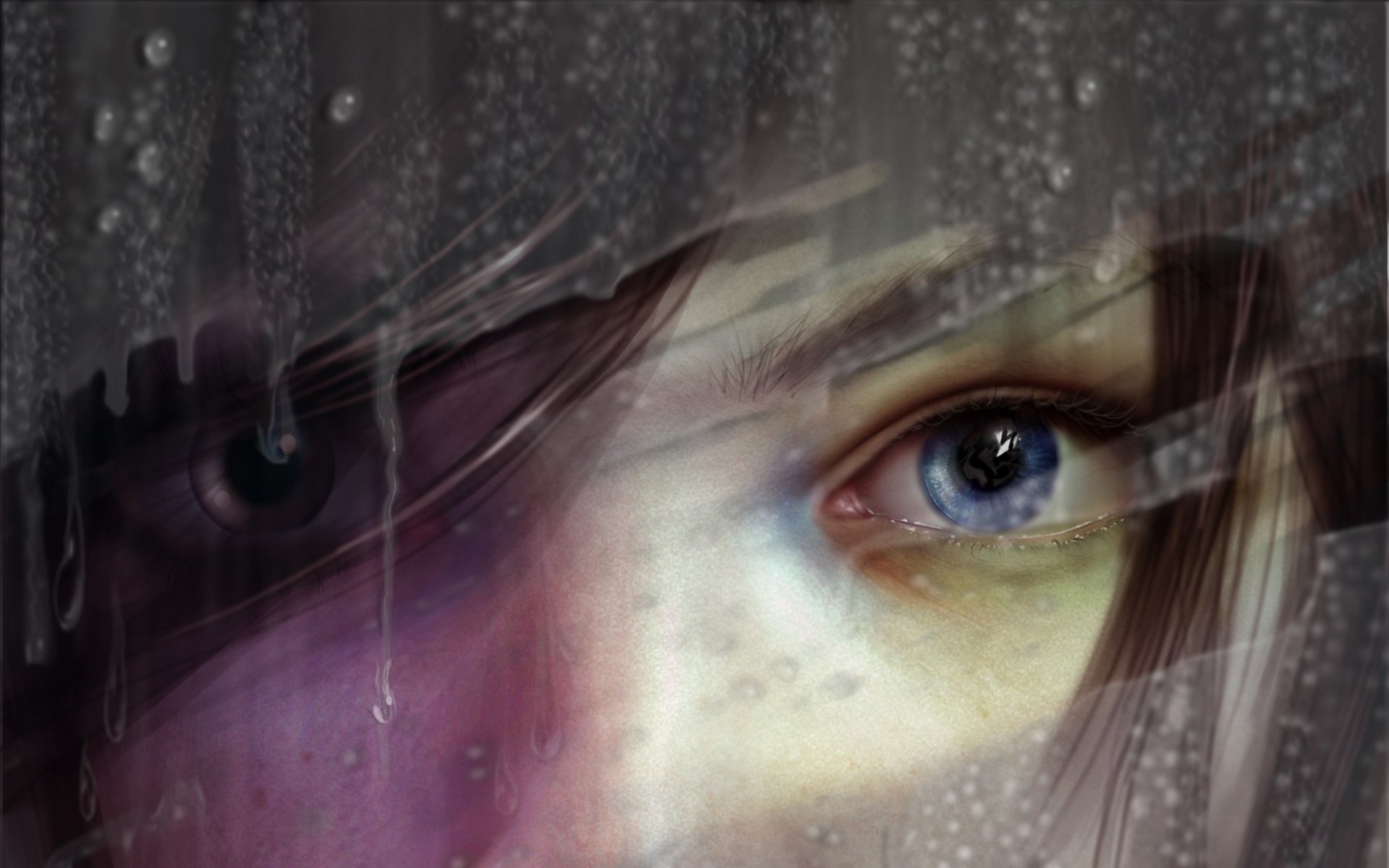 Chica con el pelo largo, hermosos ojos morados mirando la puesta de solChica con el pelo largo, hermosos ojos morados mirando la puesta de sol