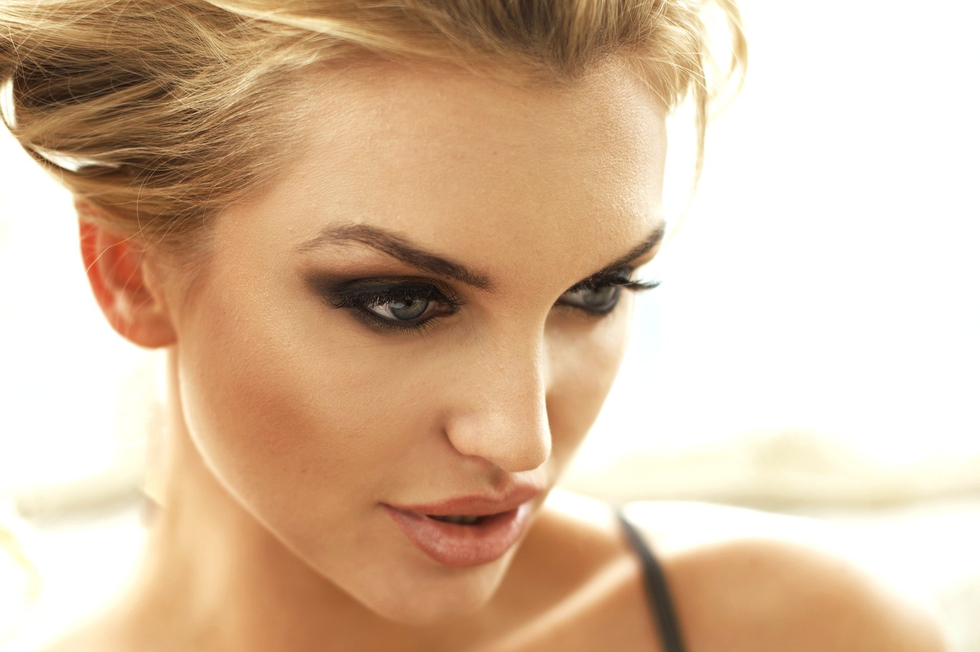 Maquillaje elegante para el modelo. las brillantes sombras de perlas azules resaltan la belleza de los ojosMaquillaje elegante para el modelo. Las brillantes sombras de perlas azules resaltan la belleza de los ojos