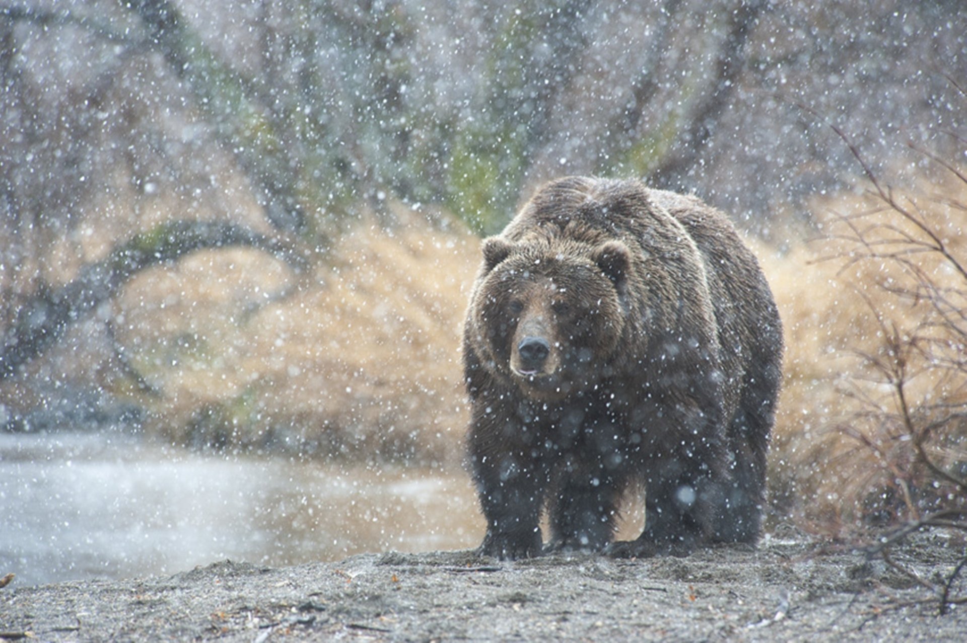 Oso sentado contra una pared gris en una pose de yogaOso sentado contra una pared gris en una pose de yoga