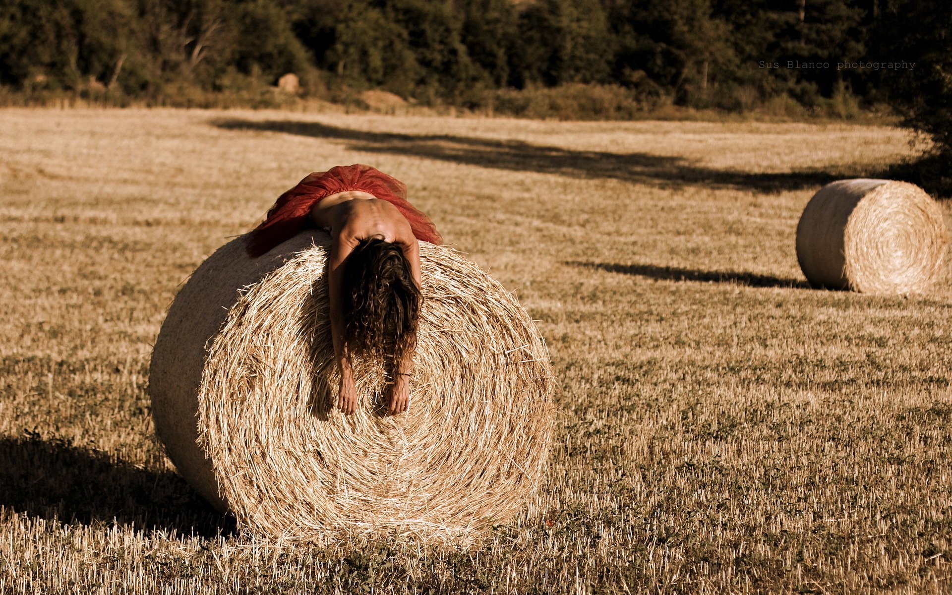 Joven morena posando en pose de perrito en un pajarJoven morena posando en pose de perrito en un pajar