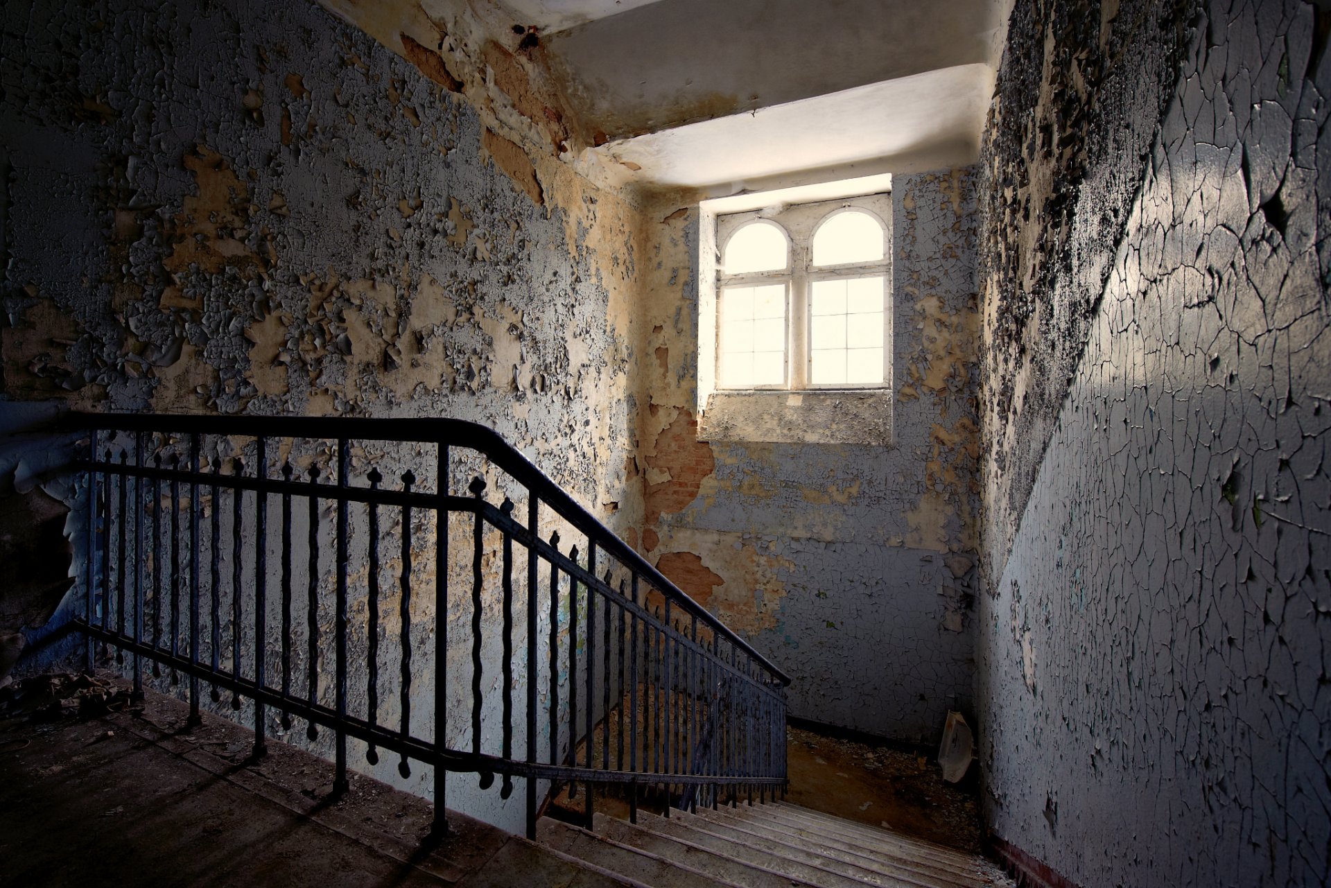 Escalera con pintura descascarada en las paredes