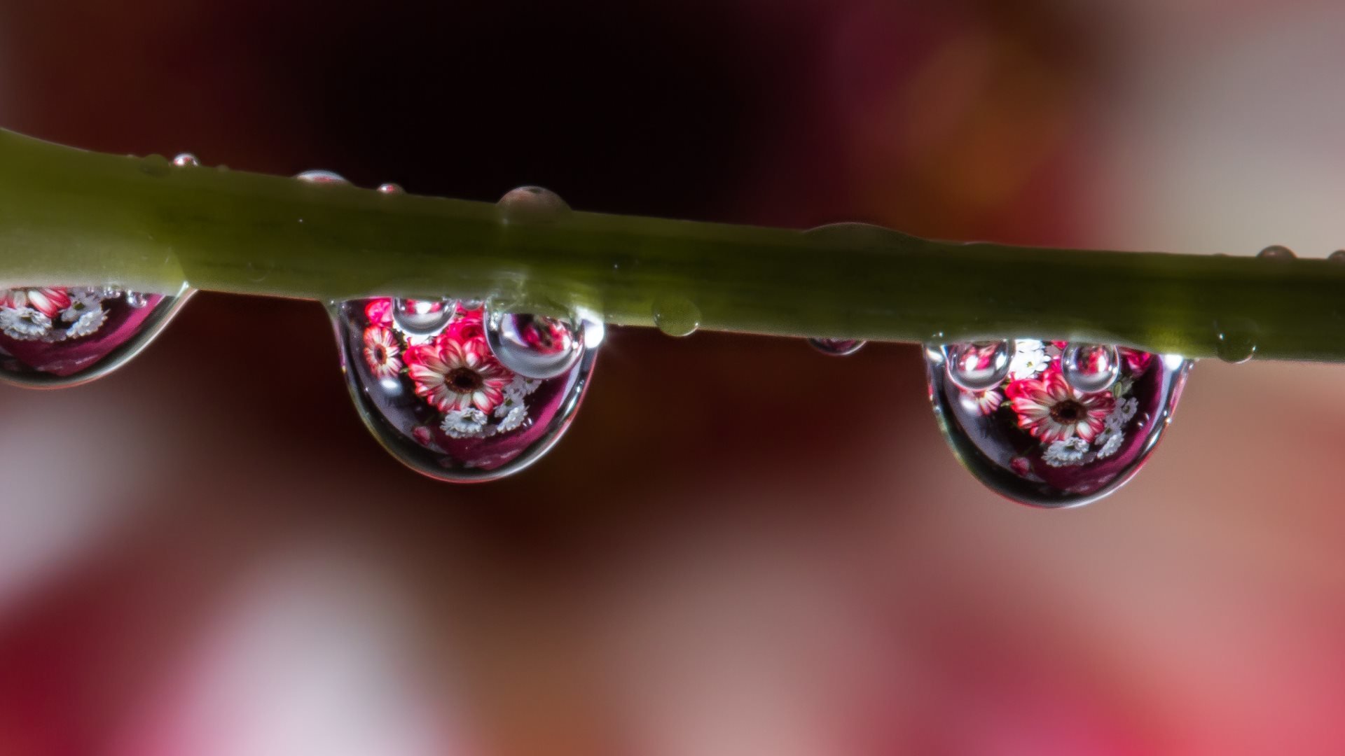 Reflejo de flores en gotas de agua en un tallo verdeReflejo de flores en gotas de agua en un tallo verde