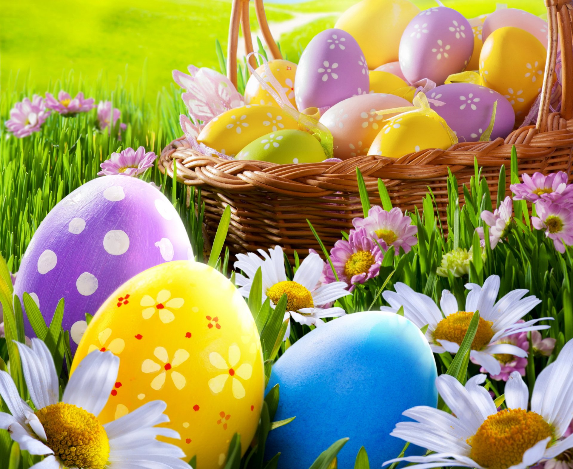 Nido de pascua: huevos pintados en hierba y en musgo con manzanillaNido de Pascua: huevos pintados en hierba y en musgo con manzanilla