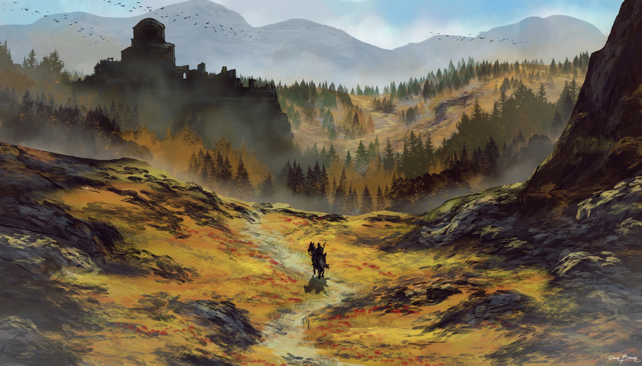 Dibujo gráfico del paisaje de un viajero en un caballoDibujo gráfico del paisaje de un viajero en un caballo