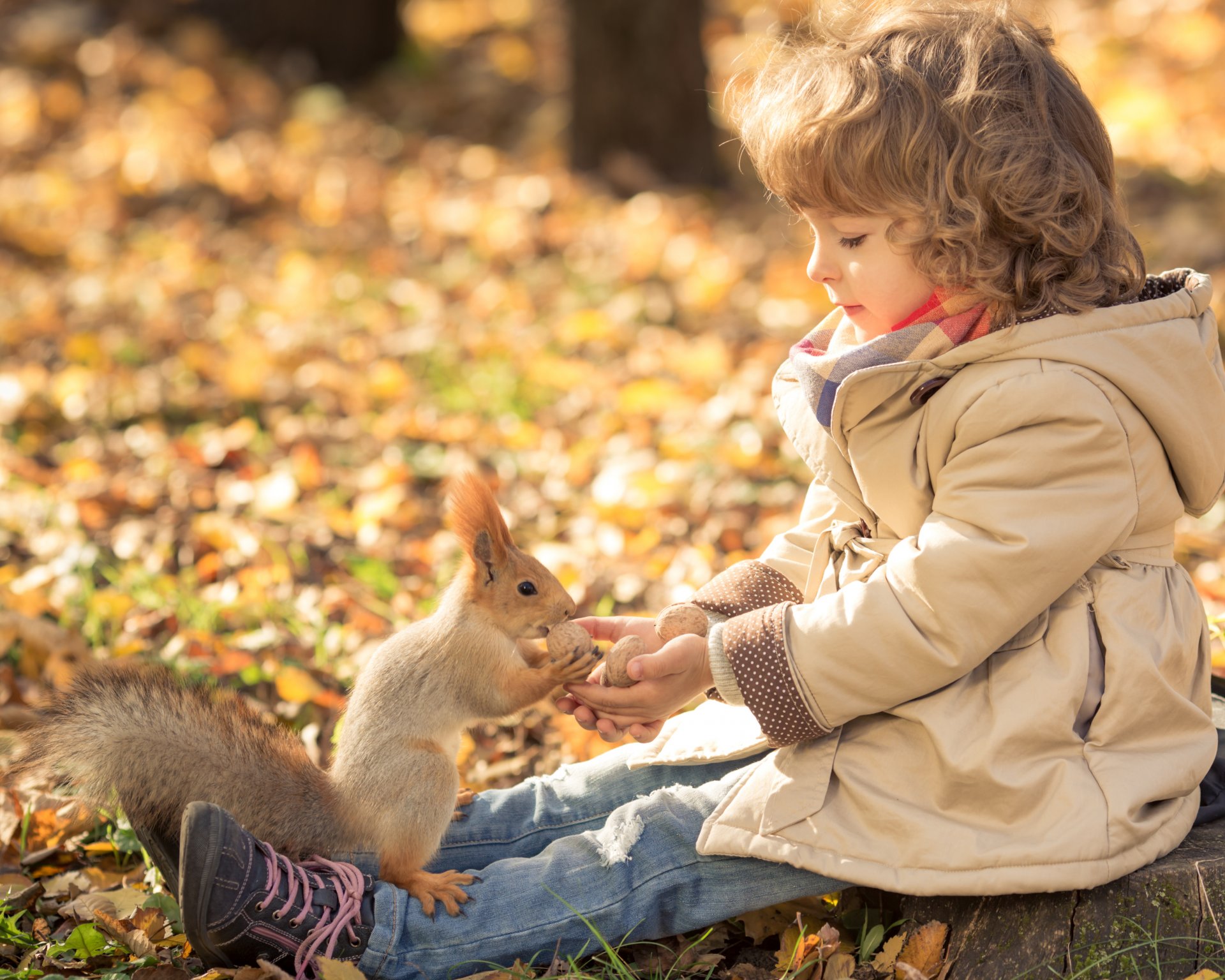 Ardilla de mano sentada en los pies de un niño