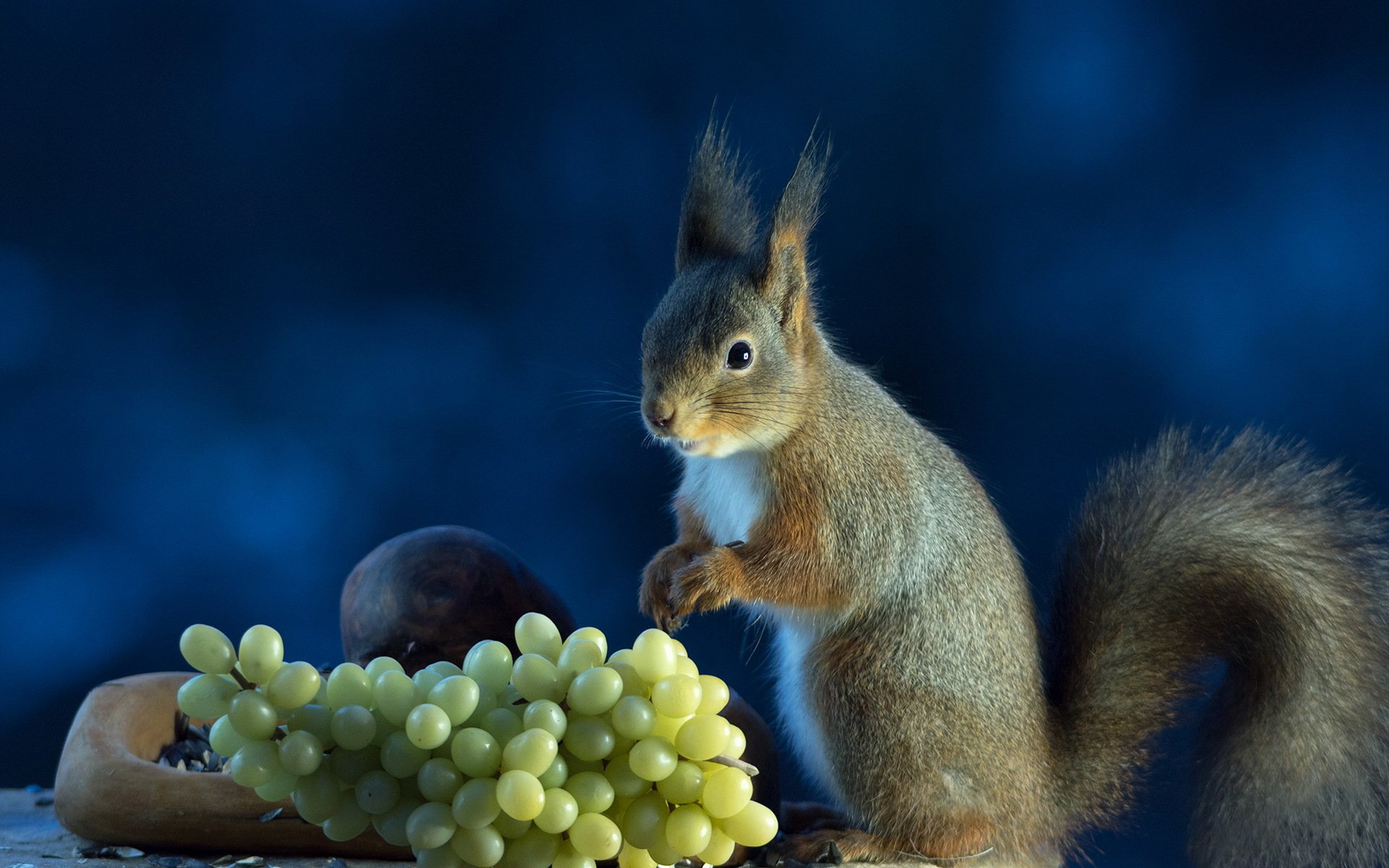 Una ardilla gris se deleita con uvas maduras sobre un fondo azul
