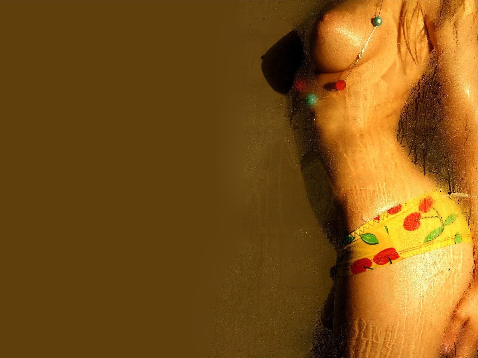 Chica en bragas con pechos desnudos detrás de un vaso con gotas de aguaChica en bragas con pechos desnudos detrás de un vaso con gotas de agua