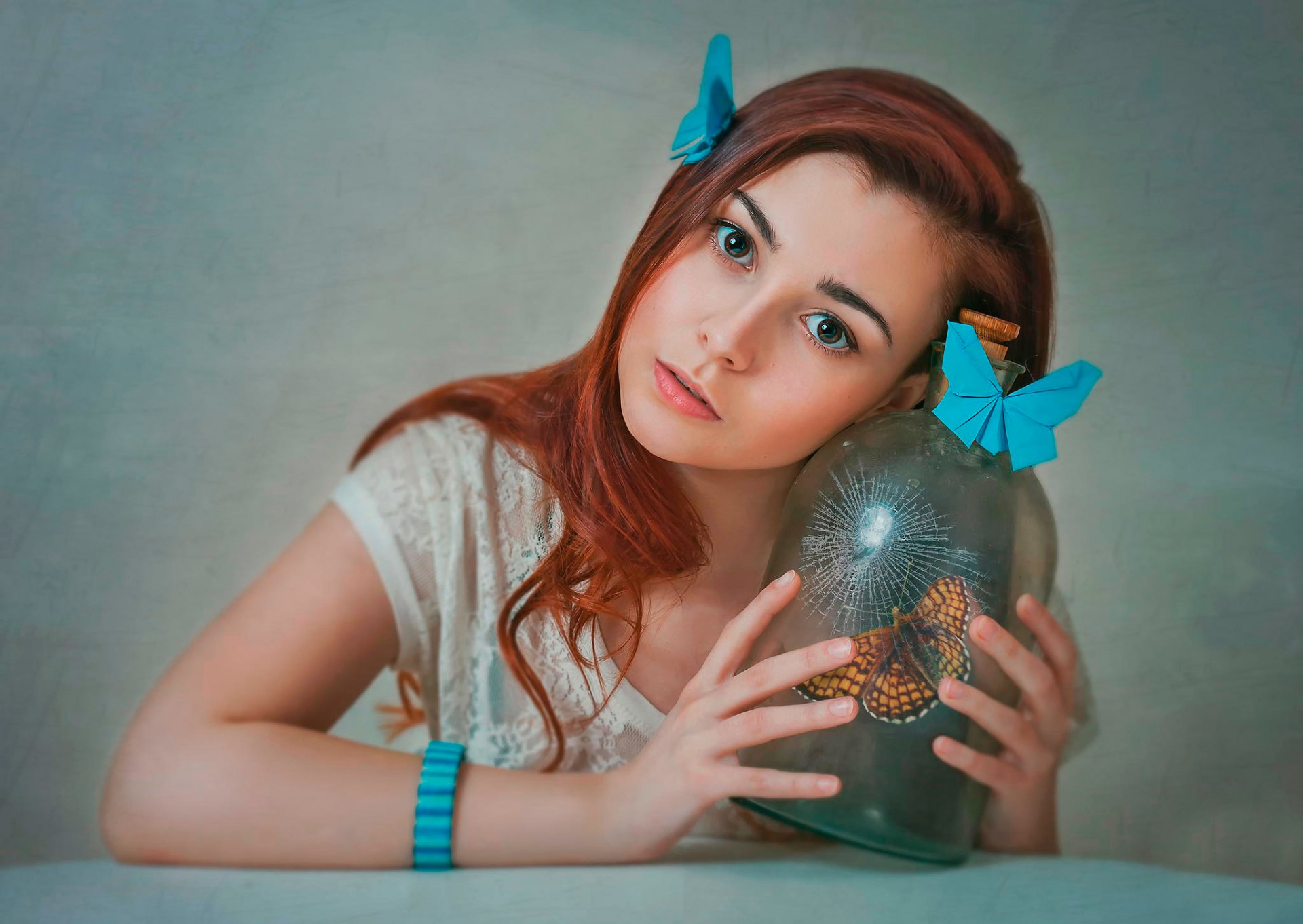 Retrato de una chica pelirroja con mariposas