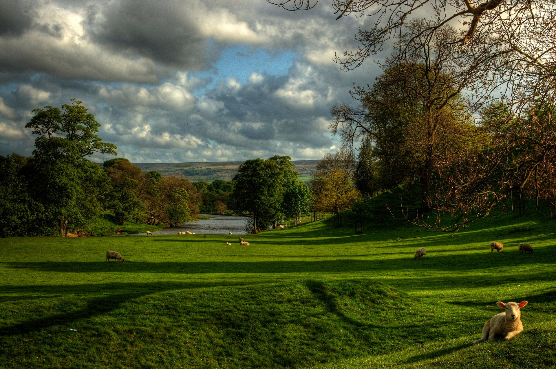 Ovejas pastando en la ladera verde