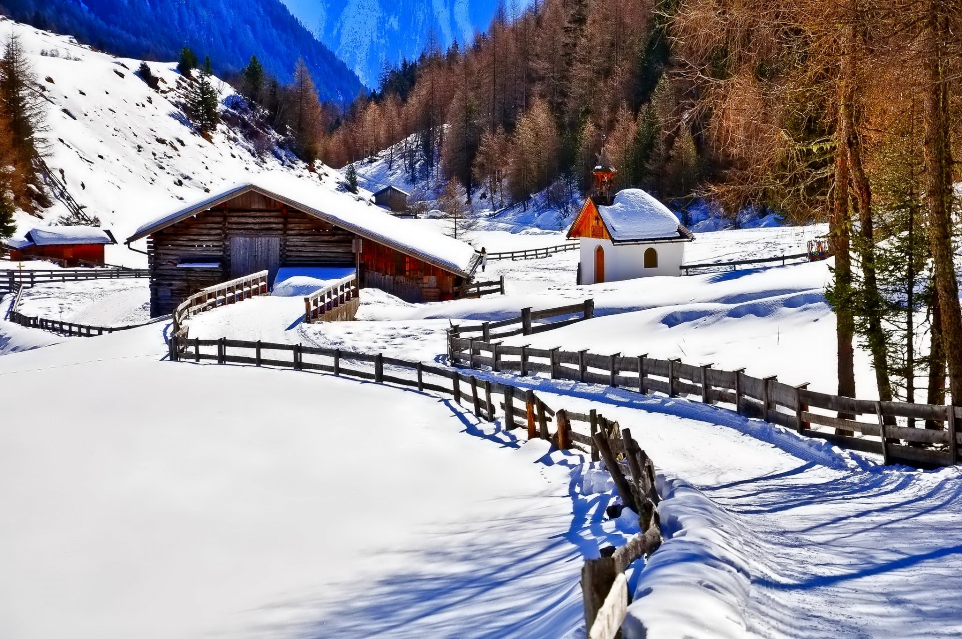 Montañas de invierno con bosques cubiertos de nieve . en la parte baja de las casas con el camino vallado de la vallaMontañas de invierno con bosques cubiertos de nieve . En la parte baja de las casas con el camino vallado de la valla