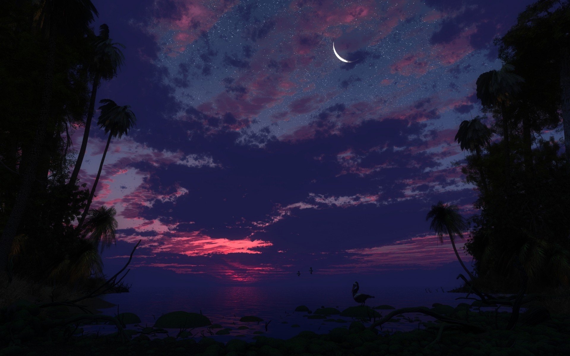 Playa tropical al atardecer. procesamiento de fotos en color azul. playa de arenaPlaya tropical al atardecer. Procesamiento de fotos en color azul. Playa de arena