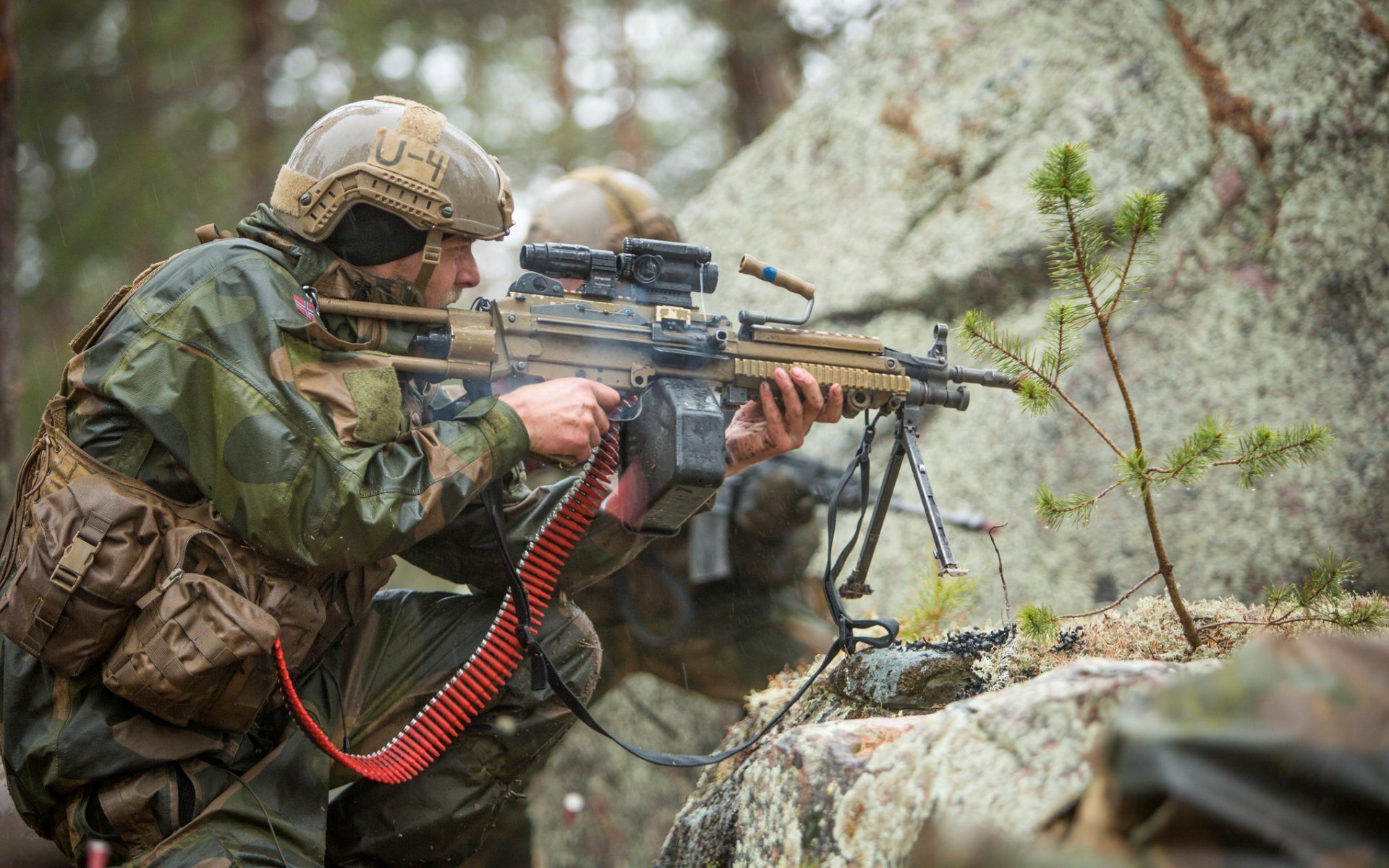 Un soldado apunta a un puente con un arma de fuegoUn soldado apunta a un puente con un arma de fuego