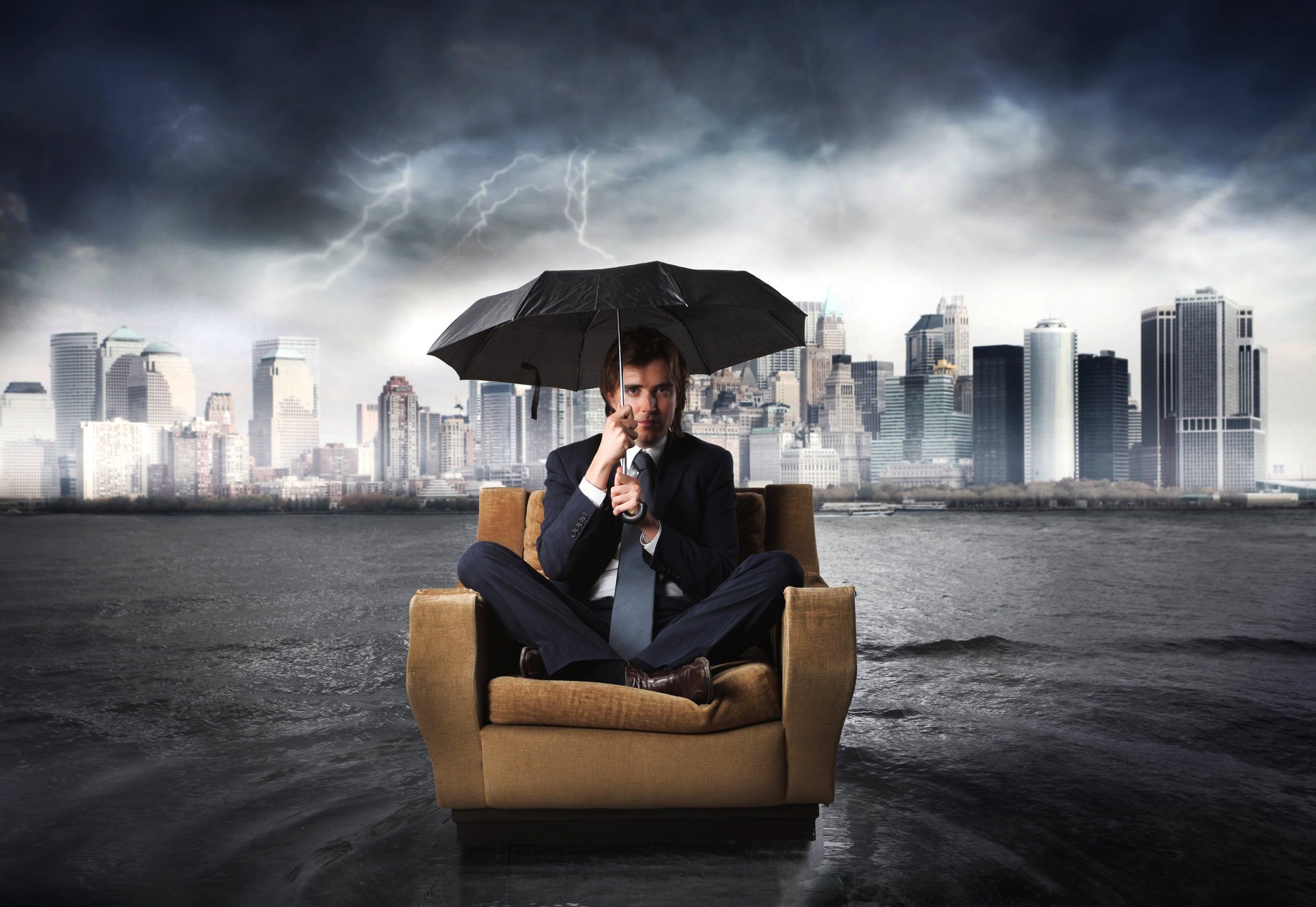 Un hombre vestido con un paraguas flotando en una sillaUn hombre vestido con un paraguas flotando en una silla