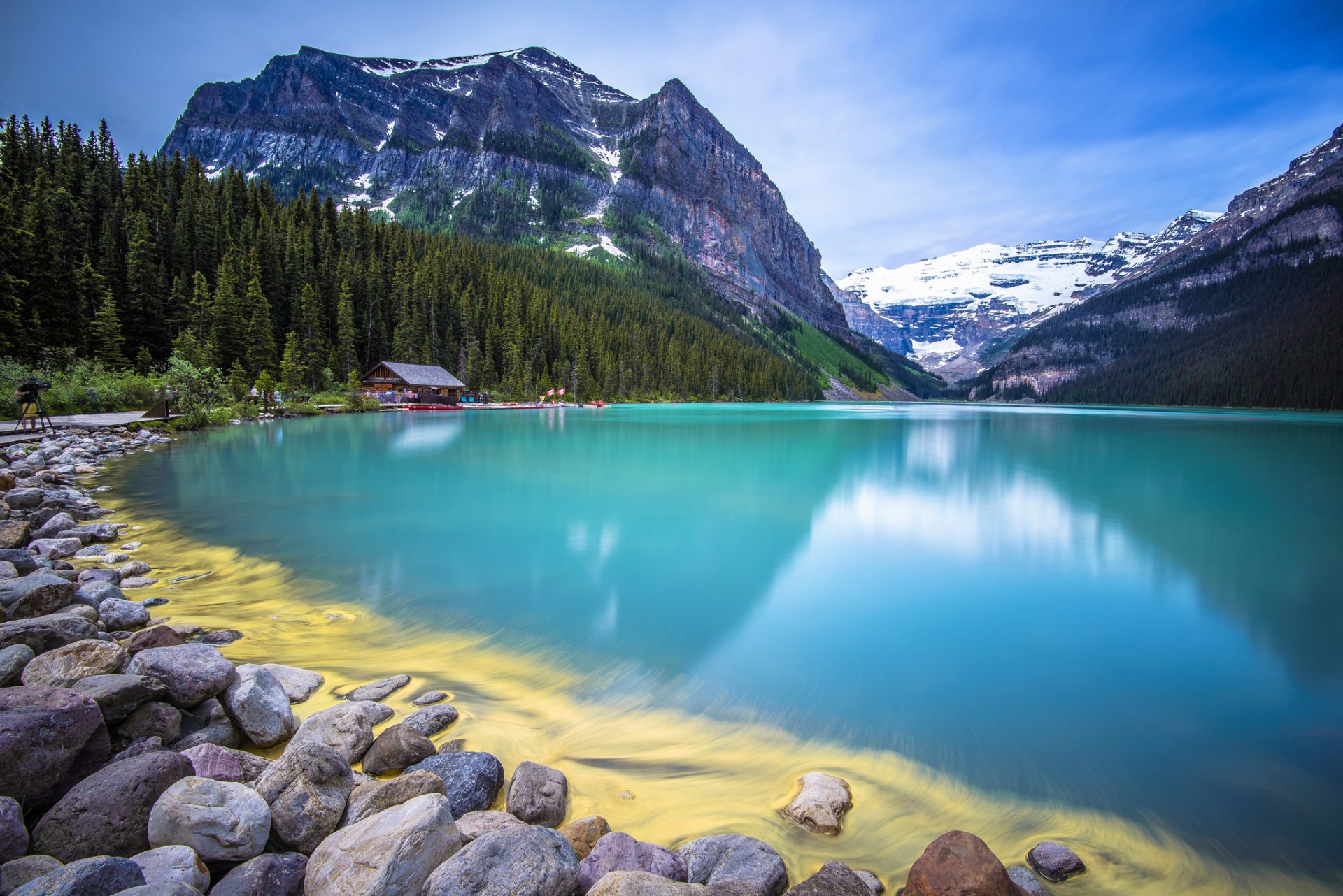 Las montañas se reflejan en la superficie acuática del lagoLas montañas se reflejan en la superficie acuática del lago