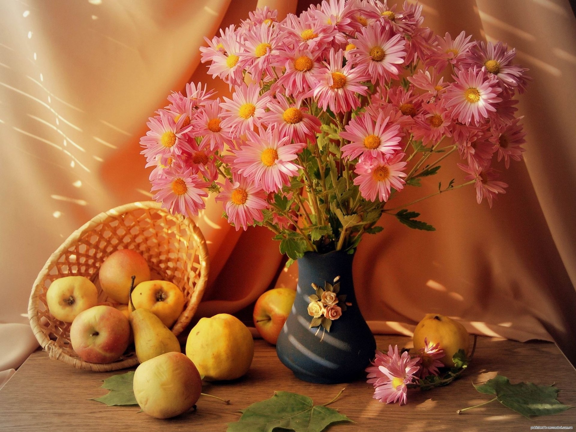 Las flores están en un jarrón y junto a una cesta de manzanasLas flores están en un jarrón y junto a una cesta de manzanas