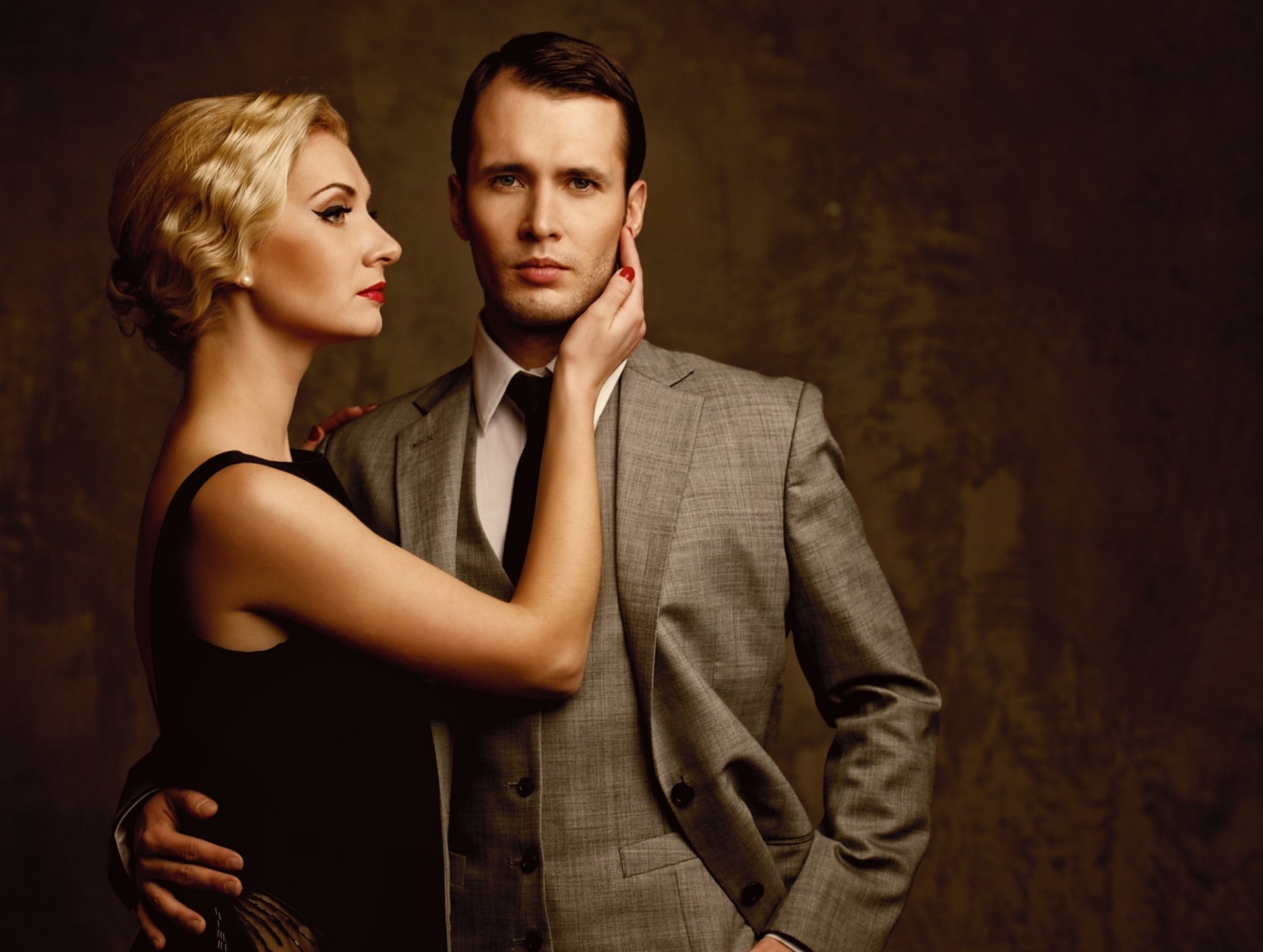 Chica rubia con un hombre en una chaqueta en la foto retroChica rubia con un hombre en una chaqueta en la foto retro