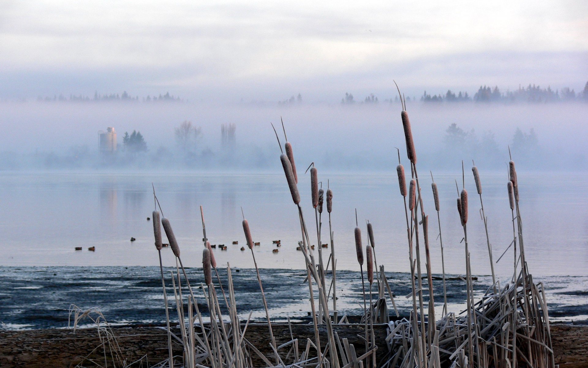 Cañas en medio de la niebla