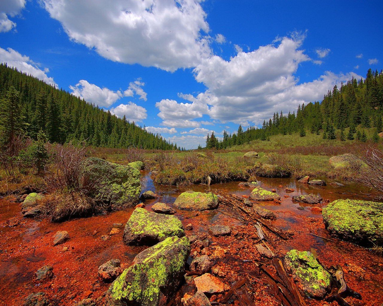 Pantano cubierto de hierba en el fondo de las montañas