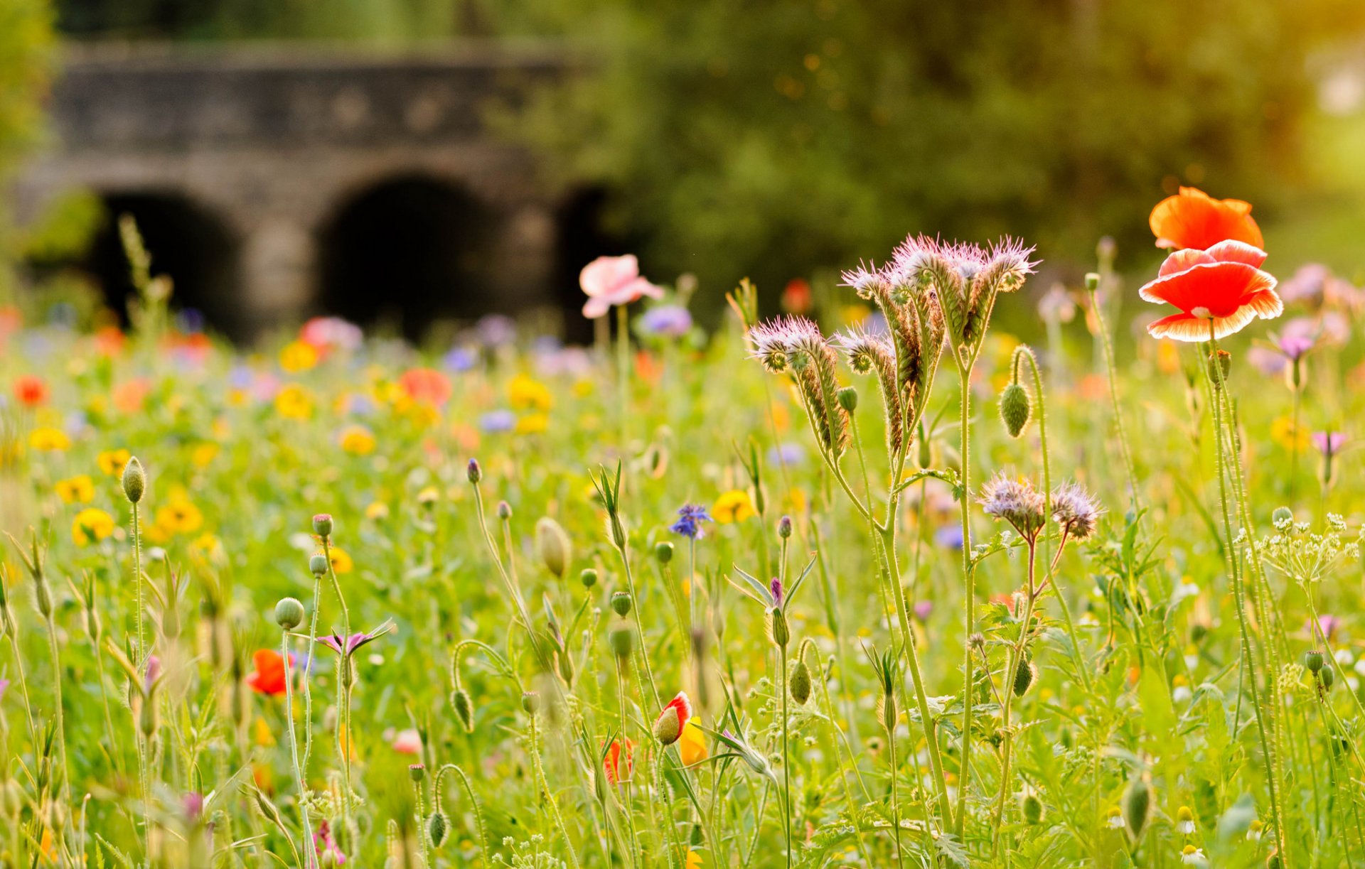 Flores silvestres en el fondo de un antiguo puente de piedraFlores silvestres en el fondo de un antiguo puente de piedra