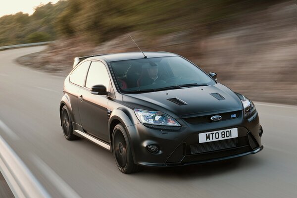 Ford Focus lateral en el tráfico en el fondo de la hermosa carretera