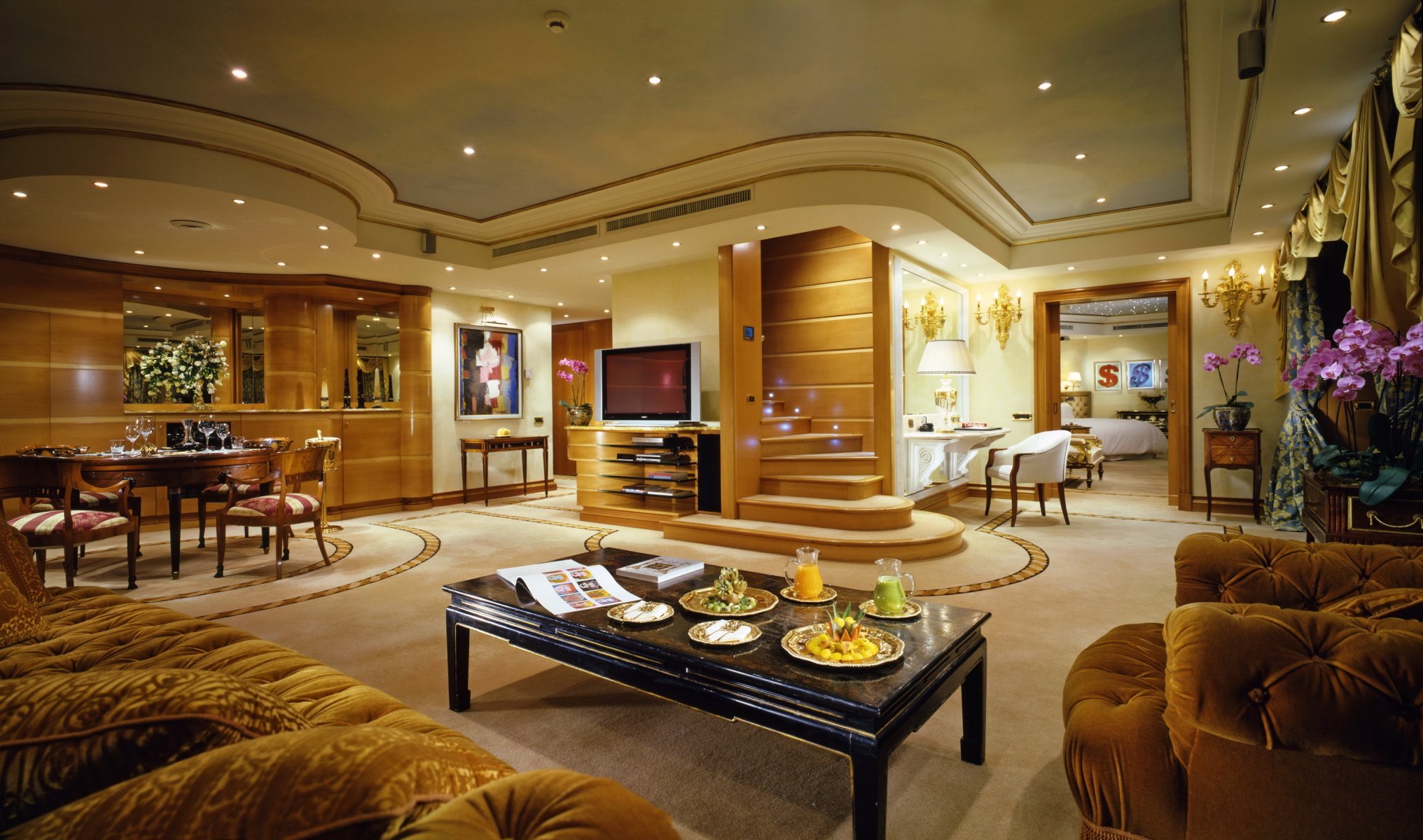 Sillones de colores y araña de cristal en la amplia sala de estar