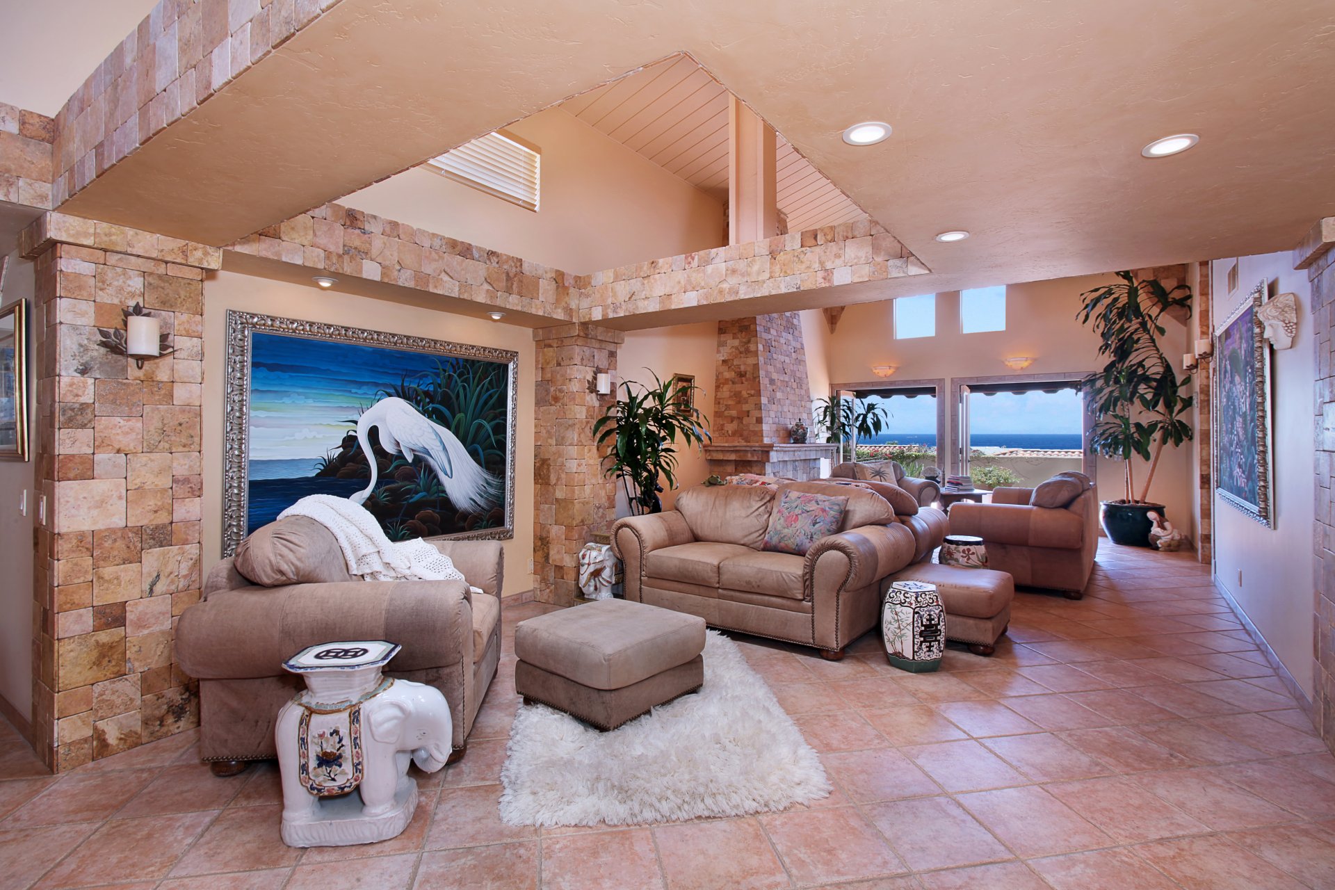 Gran sala de estar con pinturas en la pared