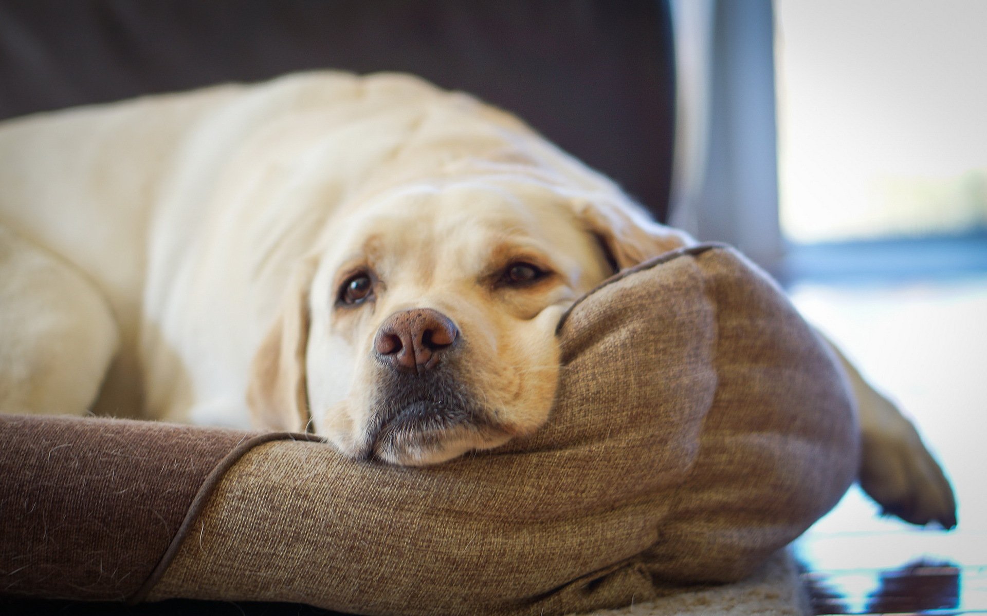El perro se acuesta y descansa en casa cuando el dueño saltó el pobre