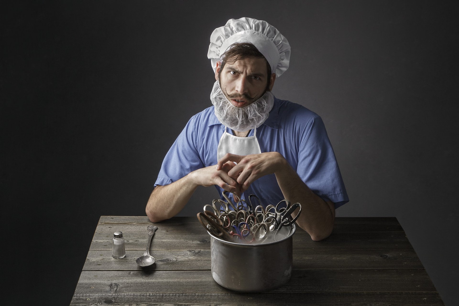 Un hombre con un traje de barbero se sienta en una mesa de madera frente a una sartén con tijeras