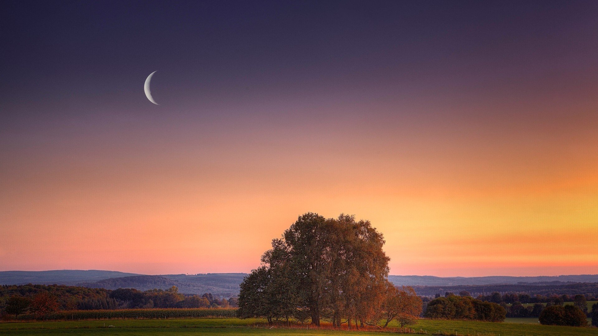 Corona de árboles en una puesta de sol roja y amarilla