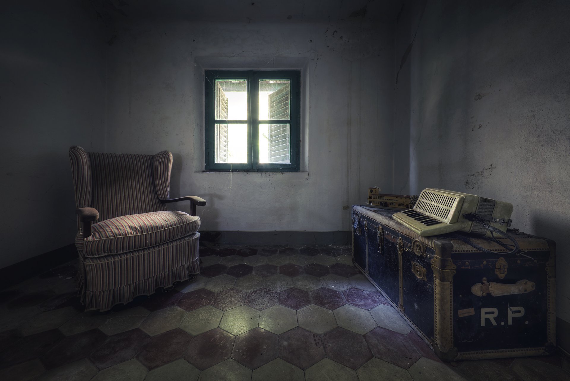 Acordeón viejo en la habitación al lado de la sillaAcordeón viejo en la habitación al lado de la silla
