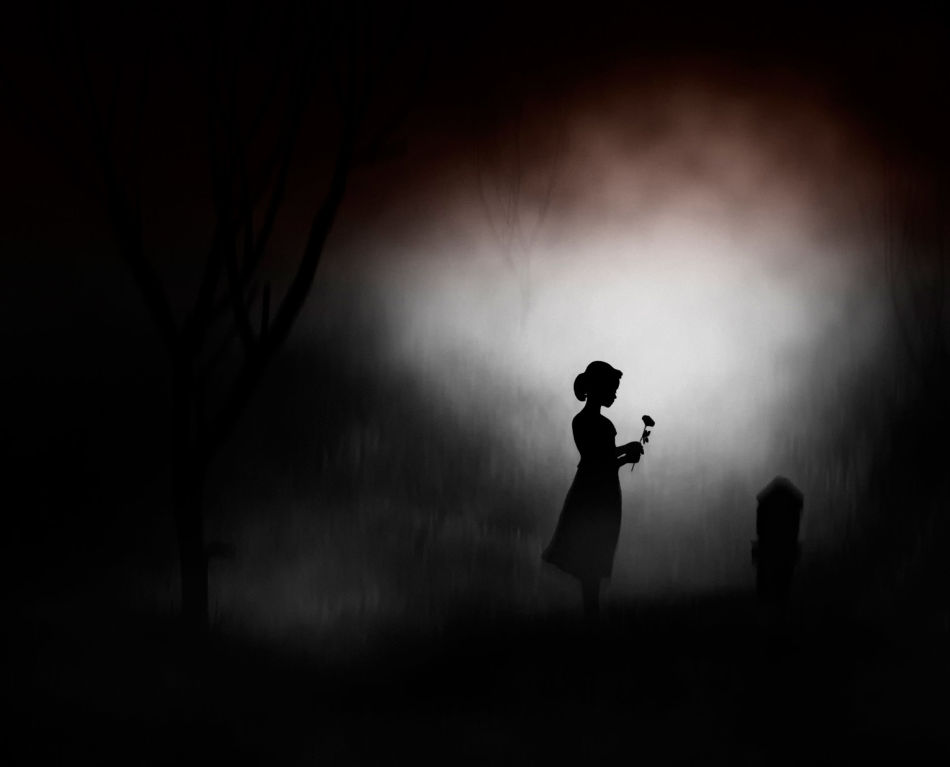 Silueta de la noche donde una chica se encuentra sobre una lápida
