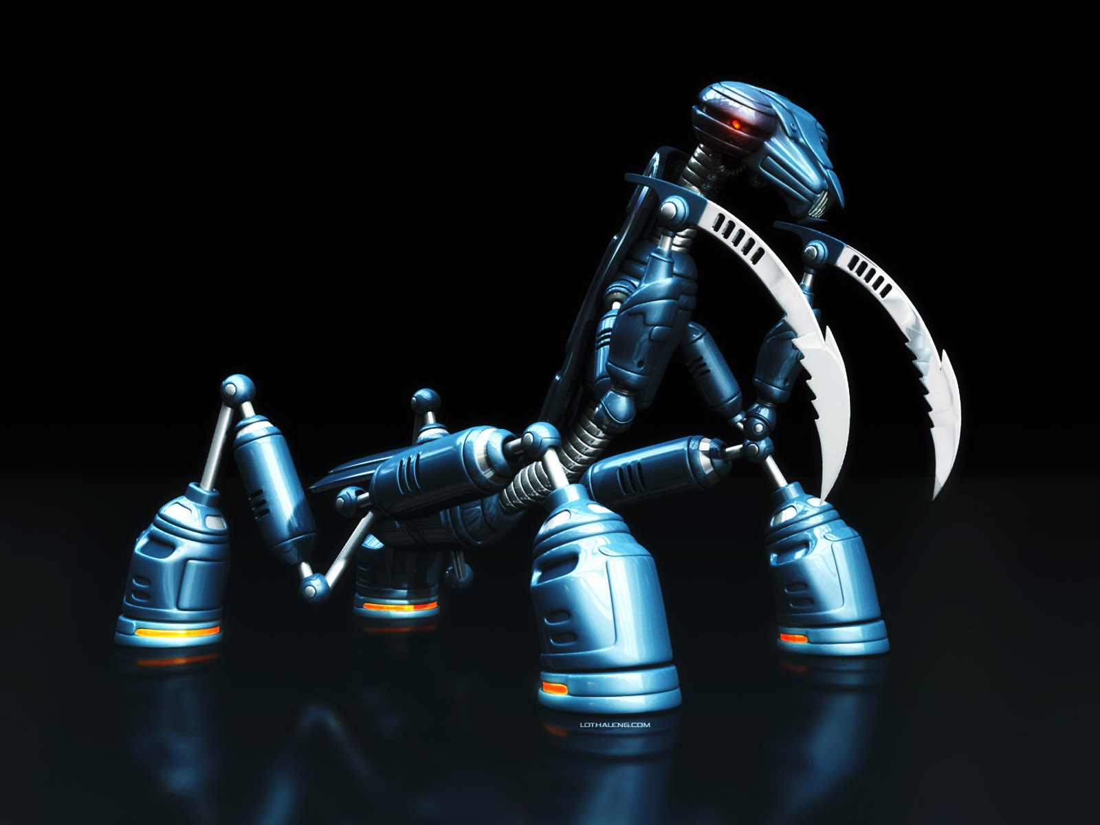 Robot mantis de metal sobre fondo negro