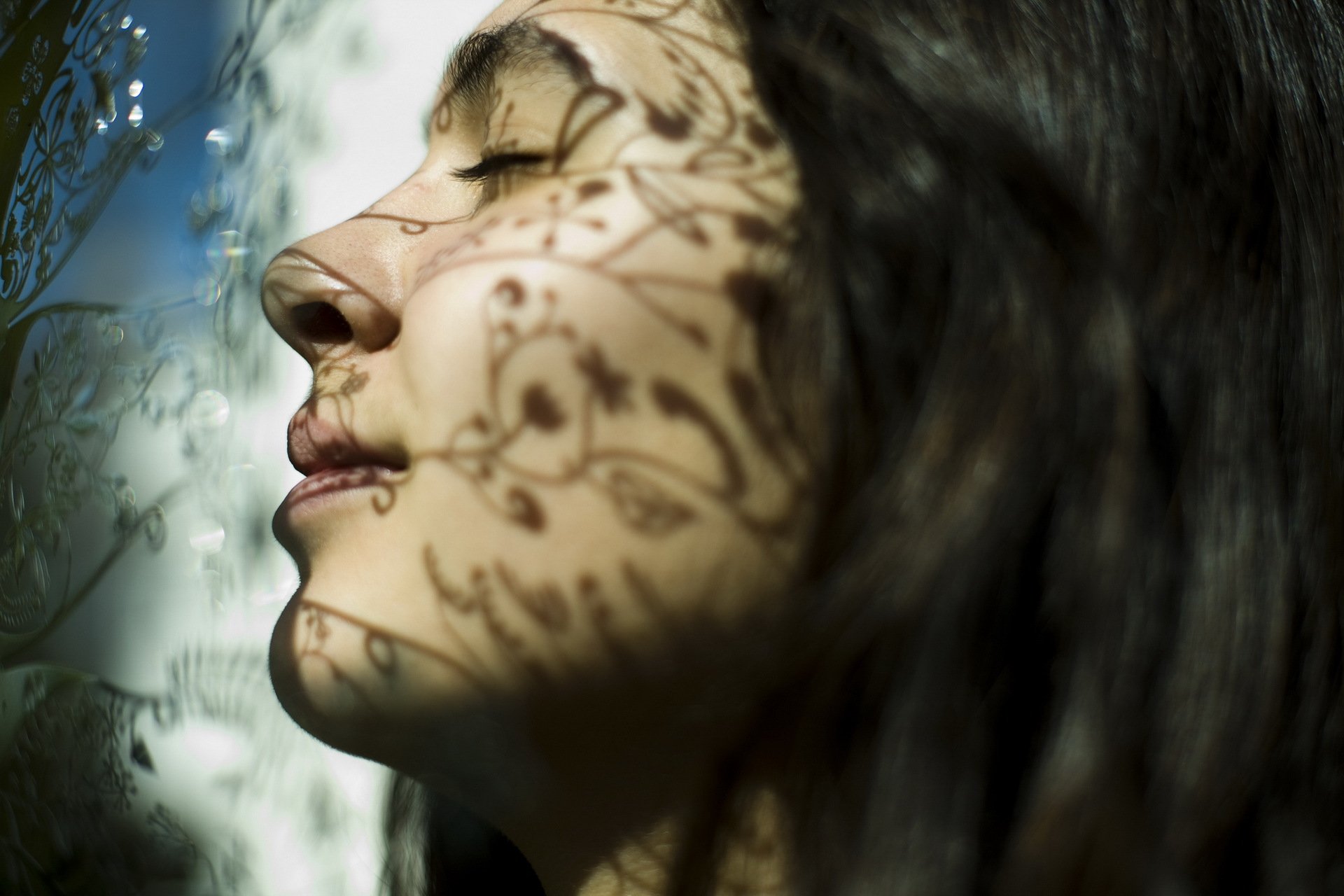 Una chica humilde con colas de caballo azules se encuentra a la sombra de un árbol verde en la hierbaUna chica humilde con colas de caballo azules se encuentra a la sombra de un árbol verde en la hierba