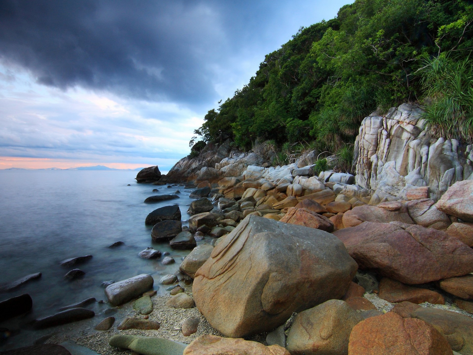 Piedras musculosas protegen la orilla que acaricia suavemente el oleajePiedras musculosas protegen la orilla que acaricia suavemente el oleaje