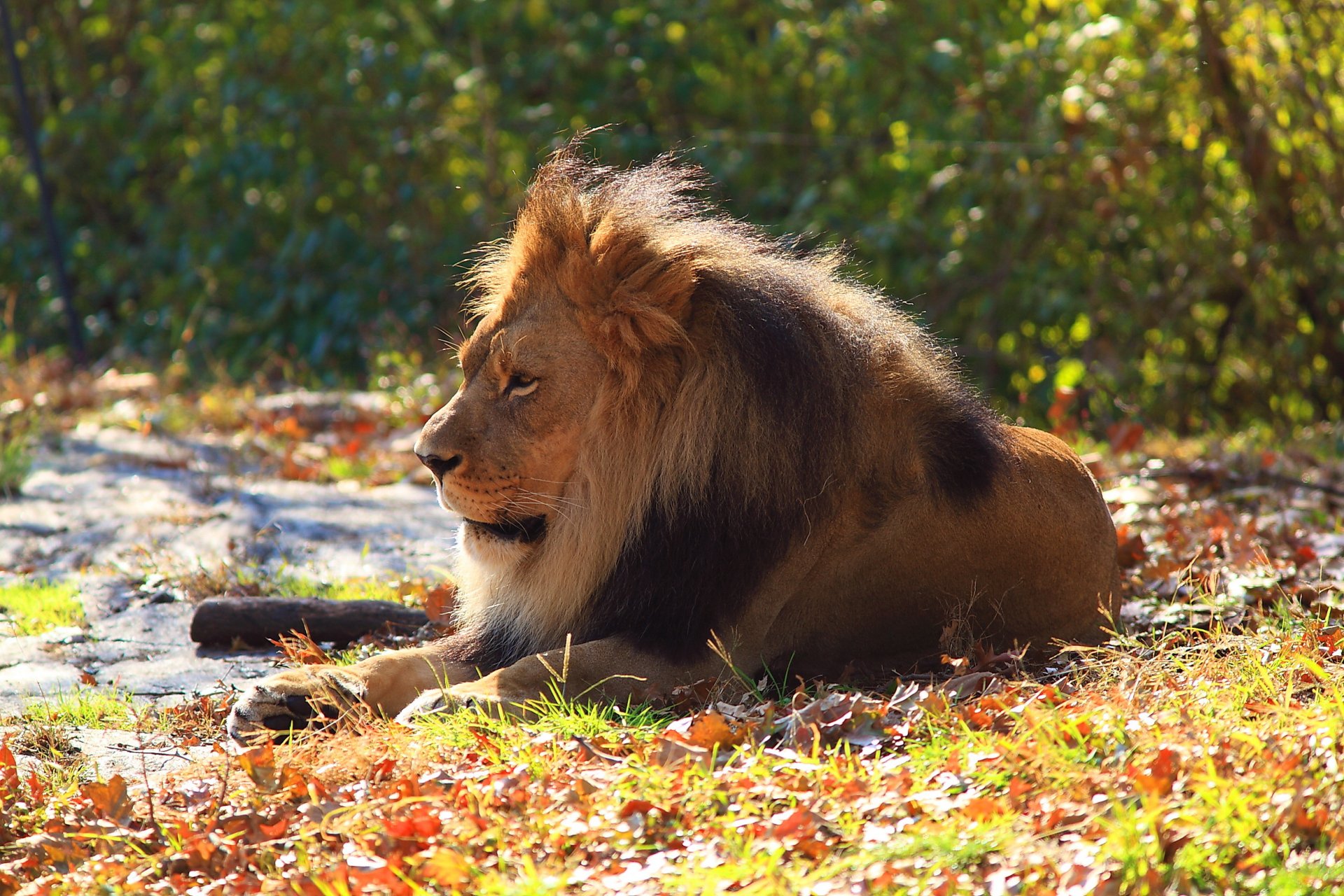Un león descansa en la hierba esperando a su hembra para que venga y diga algoUn León descansa en la hierba esperando a su hembra para que venga y diga algo