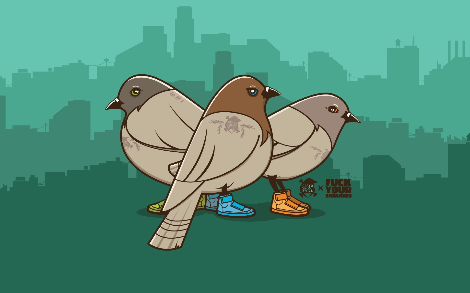 Sobre un fondo verde, tres palomas beige en zapatillas de deporteSobre un fondo verde, tres palomas beige en Zapatillas de deporte