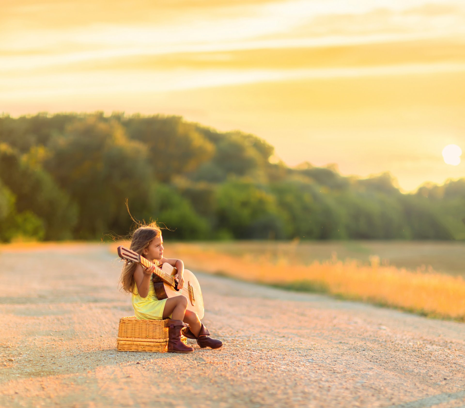 Chica en la arena con una guitarra tocando melodías desde el corazónChica en la arena con una guitarra tocando melodías desde el corazón