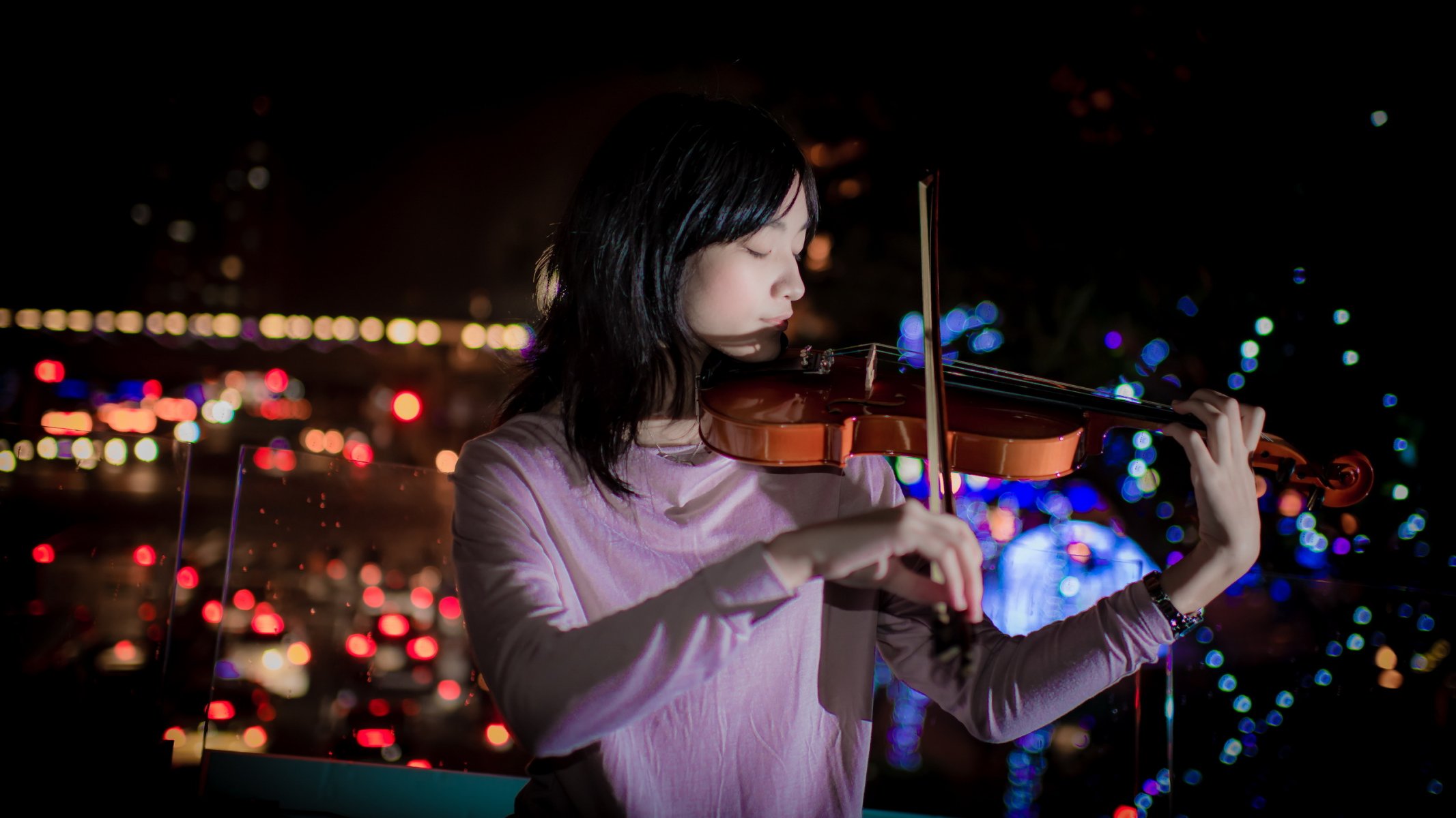 Chica tocando el violín en el fondo de la ciudad de la nocheChica tocando el violín en el fondo de la ciudad de la noche