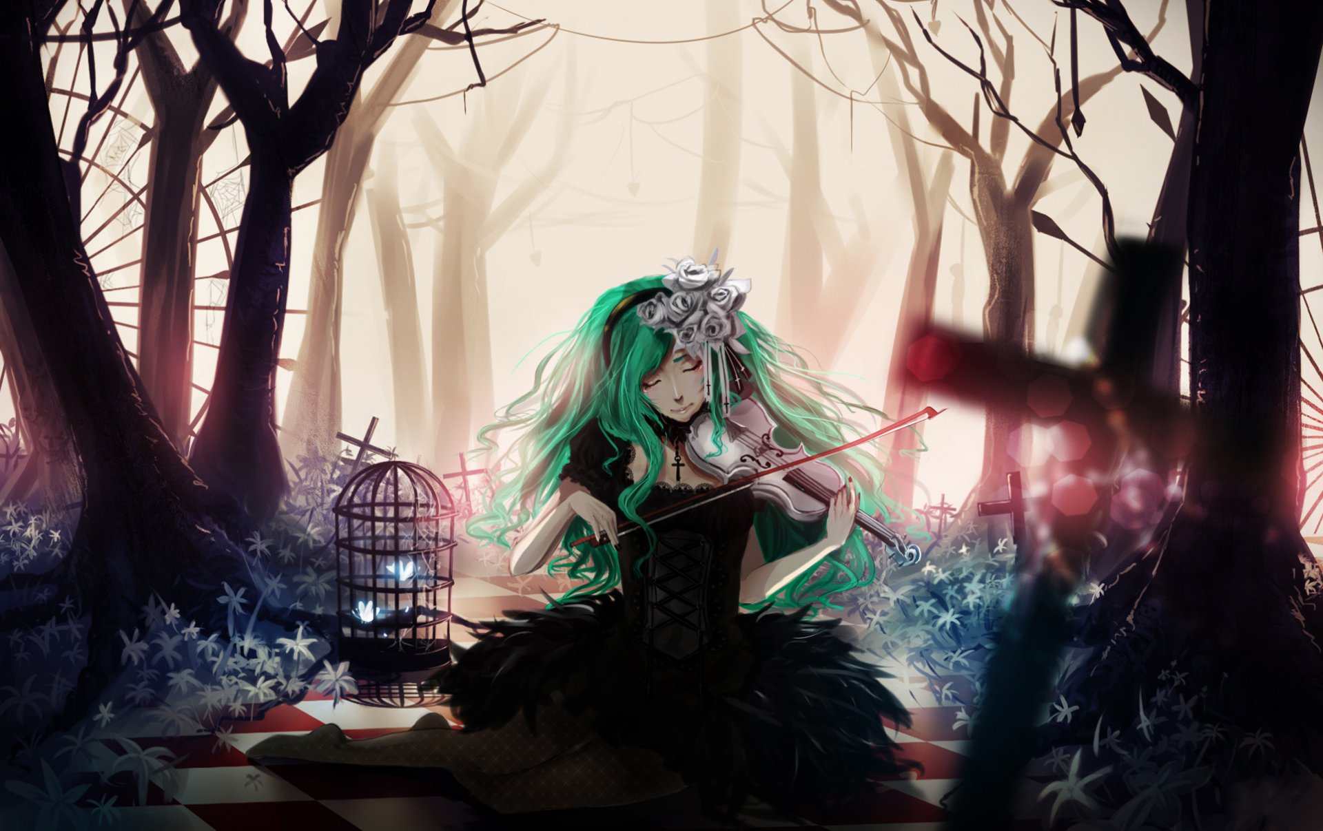 Chica tocando el violín rodeado de flores y mariposas en una jaula