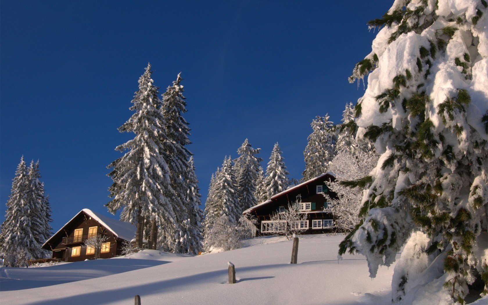 Cuento de invierno, una casa en un bosque cubierto de nieveCuento de invierno, una casa en un bosque cubierto de nieve